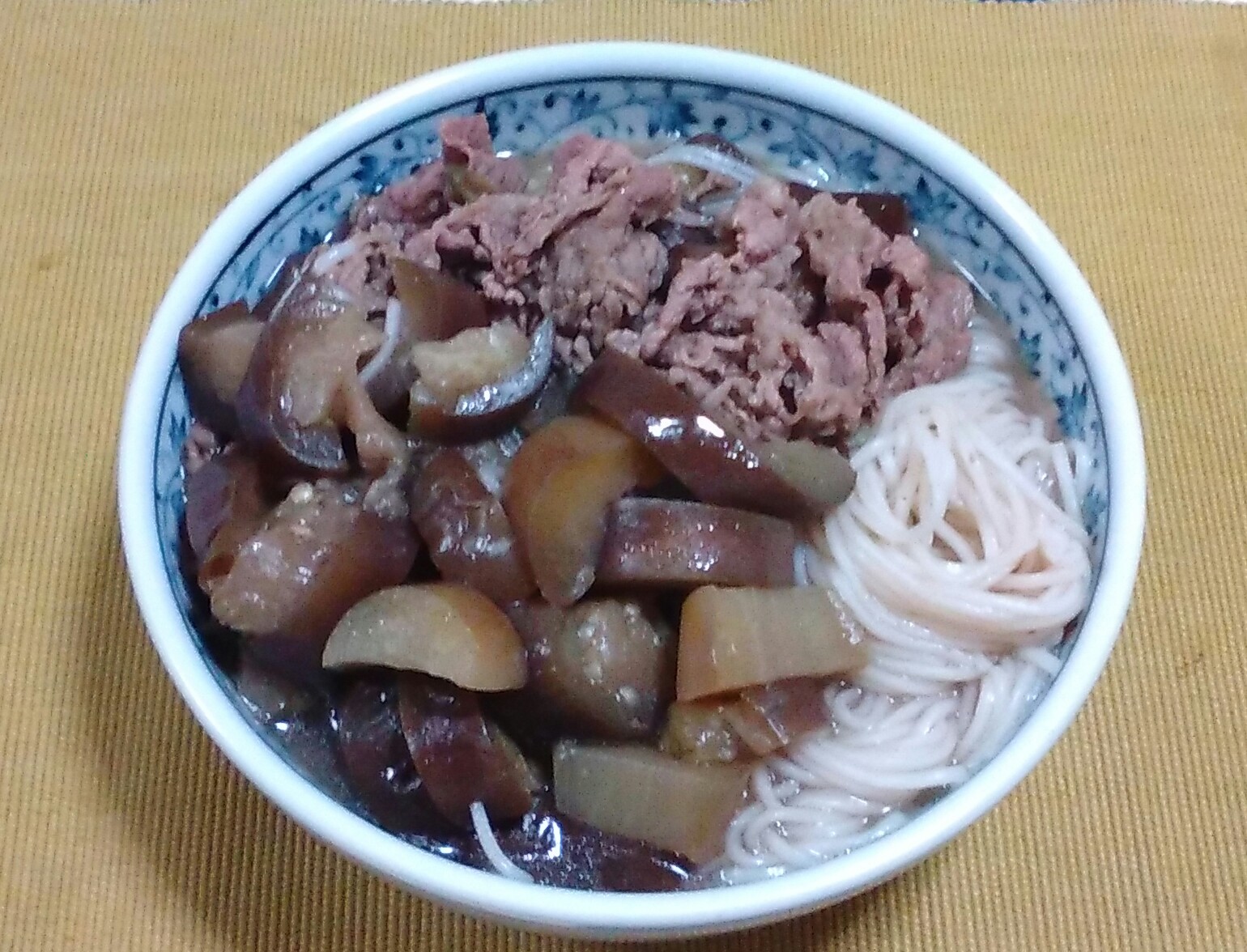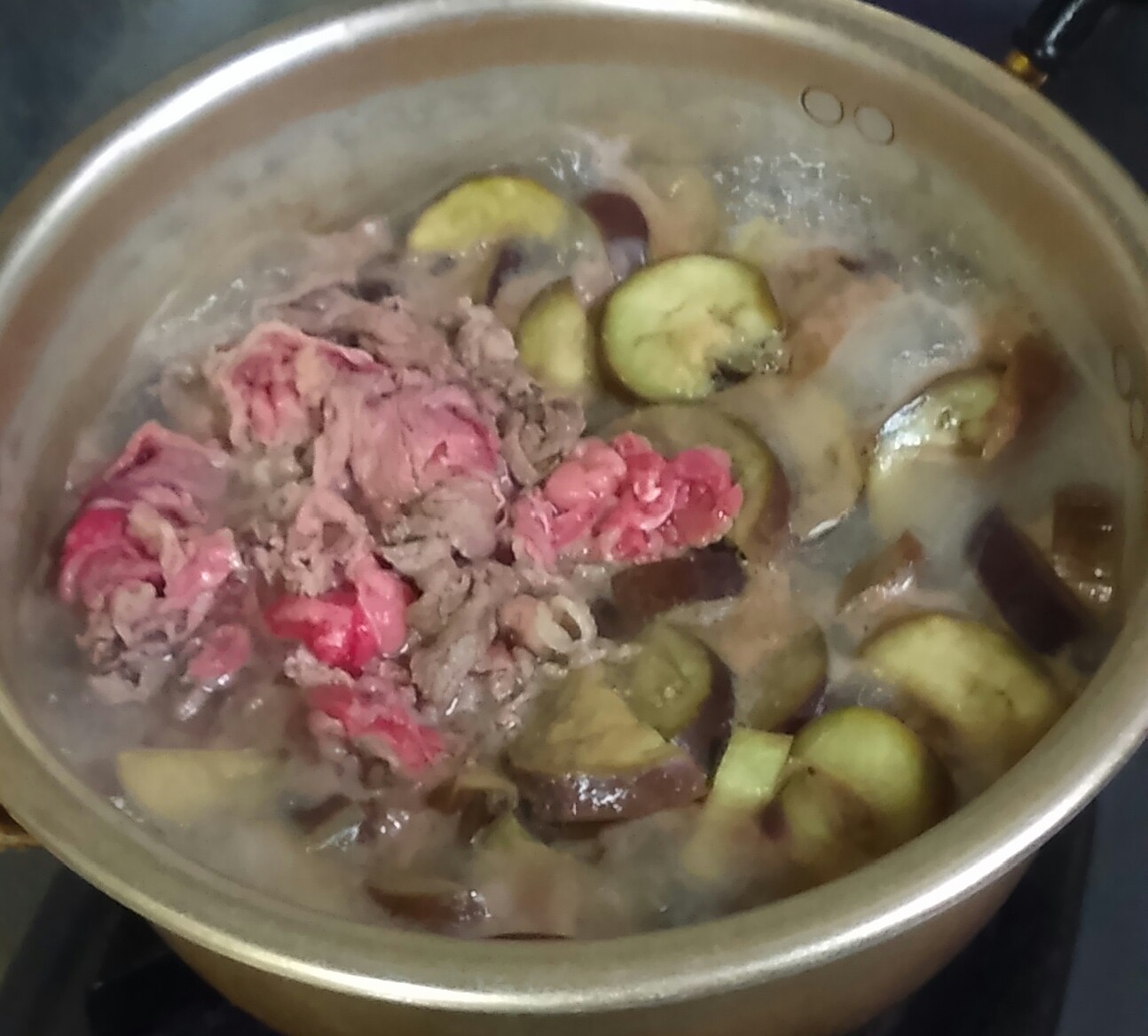 我が家の『茄子と素麺の炊いたん』は、牛肉が入り、汁を一緒に食べる薄味の煮物です。