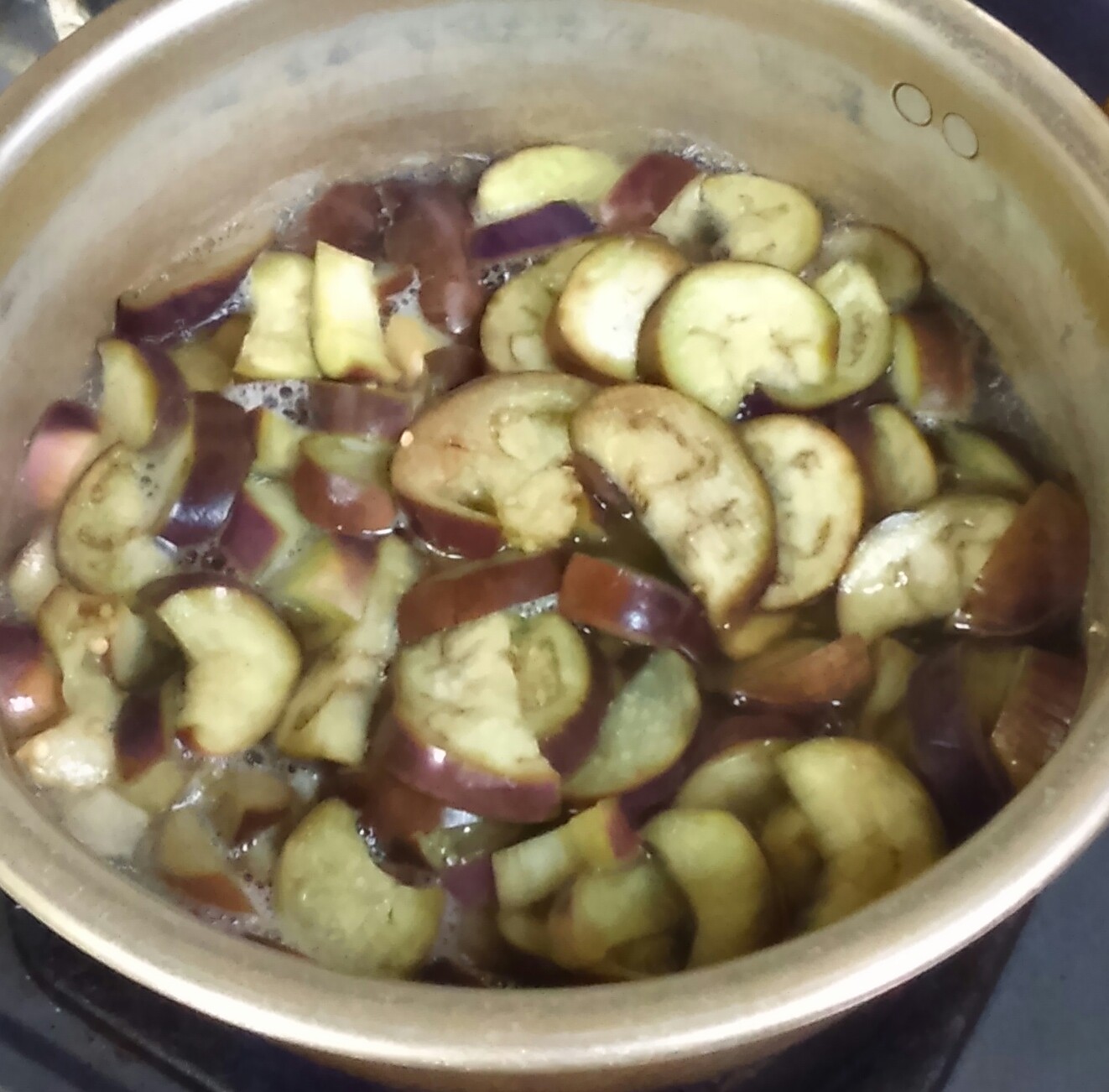 ③ダシ汁を煮立て、茄子を入れる。
