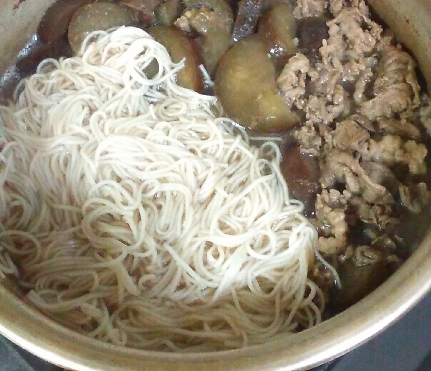牛肉は入れず、茄子と素麺をダシ汁で甘辛く炊くのだそうです。