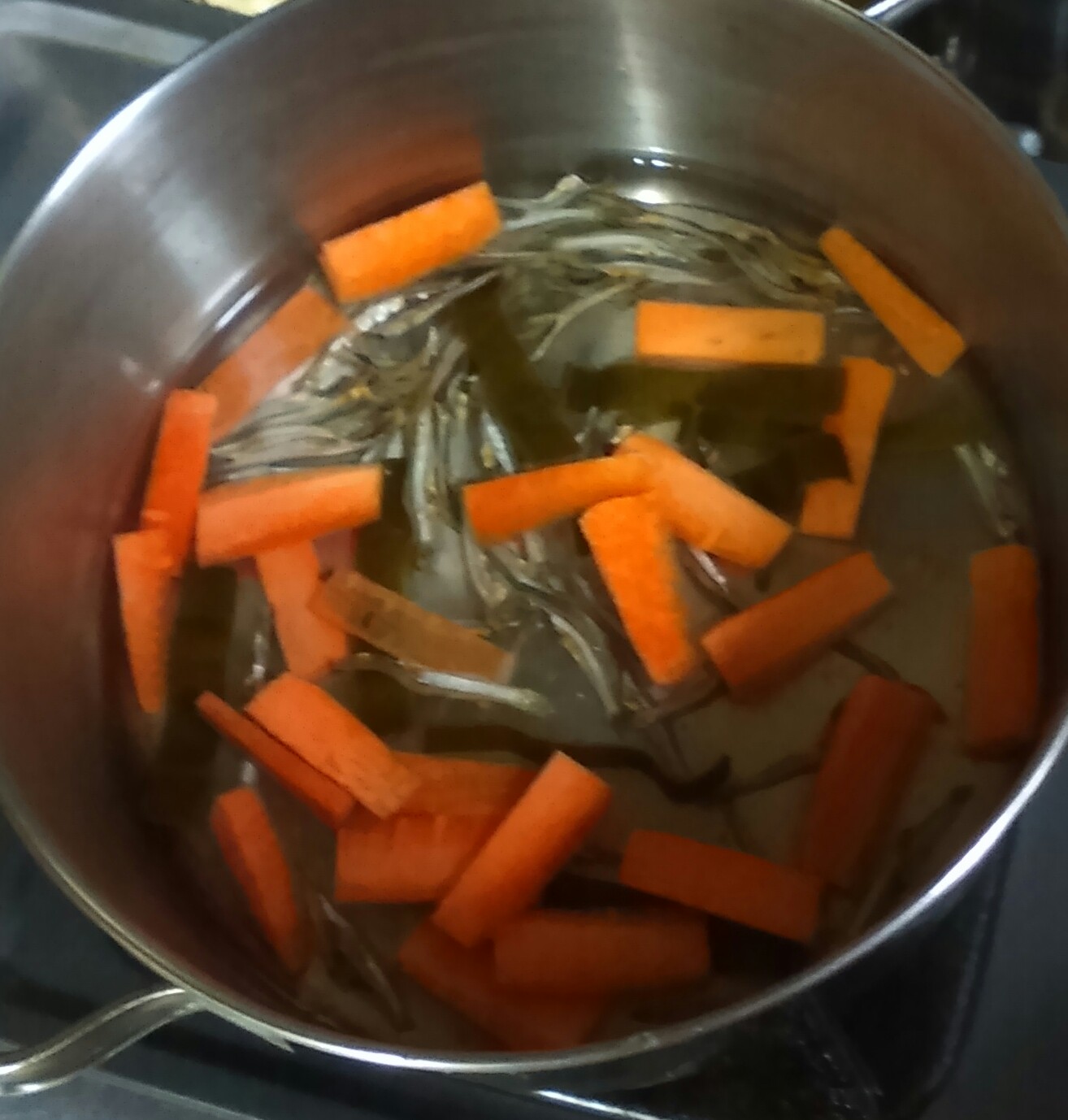 ①水に、キッチンばさみで1cm位に切った昆布、煮干し、短冊に切った人参を入れ弱めの中火にかける。