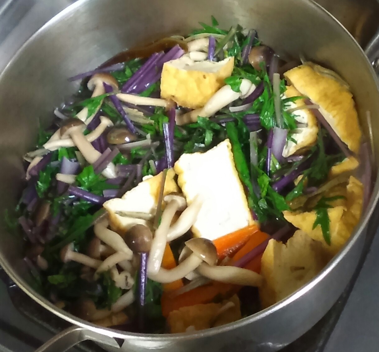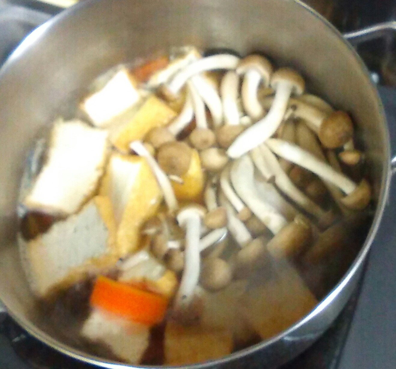 ②人参がほぼ柔らかくなれば5mm位に切った厚揚げと、いしづきを除いたしめじ、調味料を入れる。