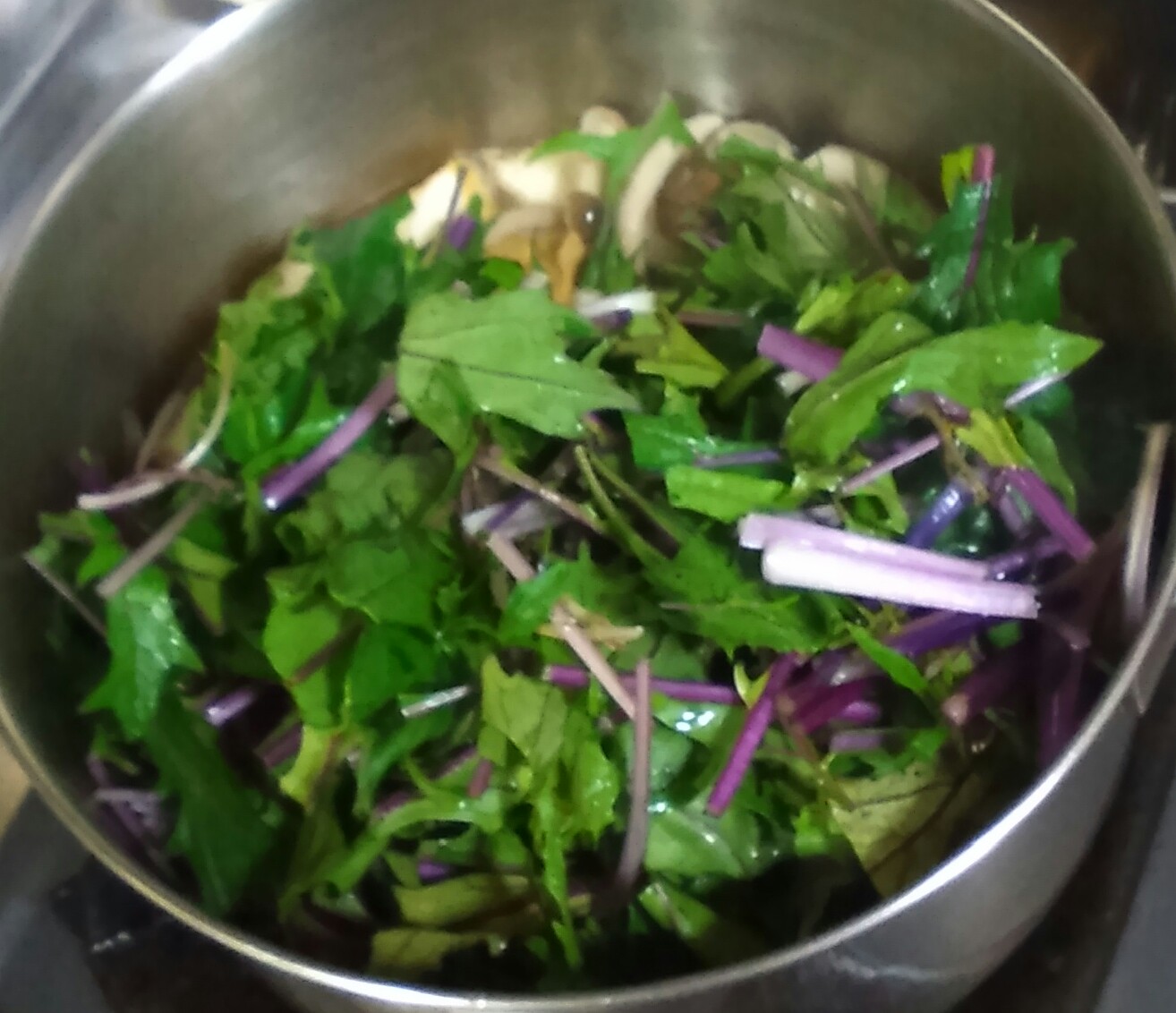 赤というより紫の水菜が、他の食材と対比してキレイなのかキレイじゃないのか微妙なところですね。