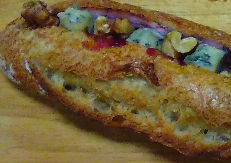ハードパンに、青カビのチーズのゴルゴンゾーラと、パストラミビーフ、くるみ(ウォールナッツだったかも?)が挟まれており、中にはラズベリーソースも。