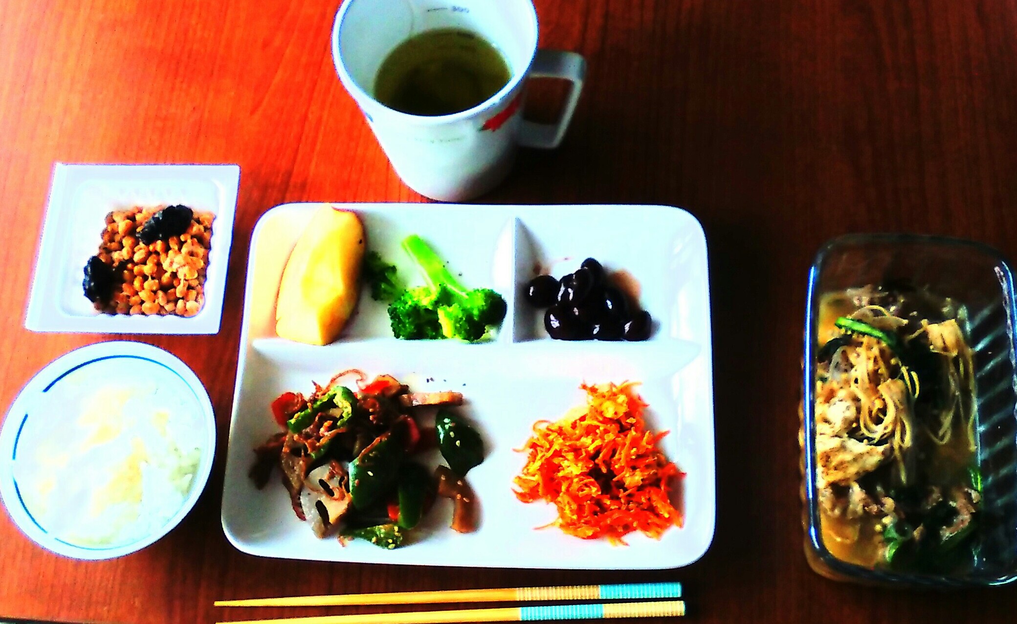 前日の晩ご飯からはクリームシチュー、朝食からはブロッコリーとアボカドとリンゴ、お弁当からはプチトマトとシメジソテーとちりめん山椒入りおにぎり。昼に用意したのは納豆だけ。