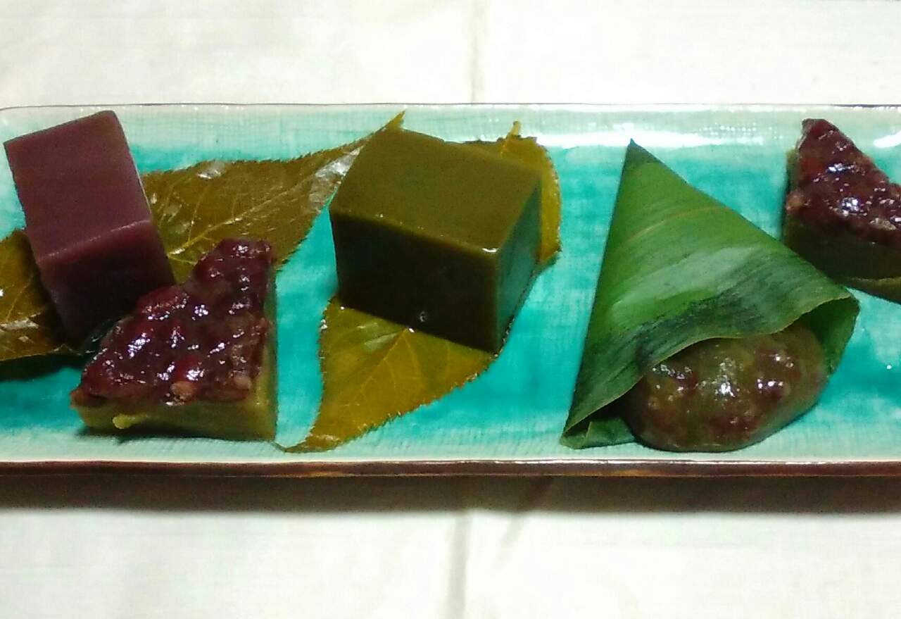 仙太郎の水羊羹と抹茶水羊羮、抹茶水無月、茶の雫。