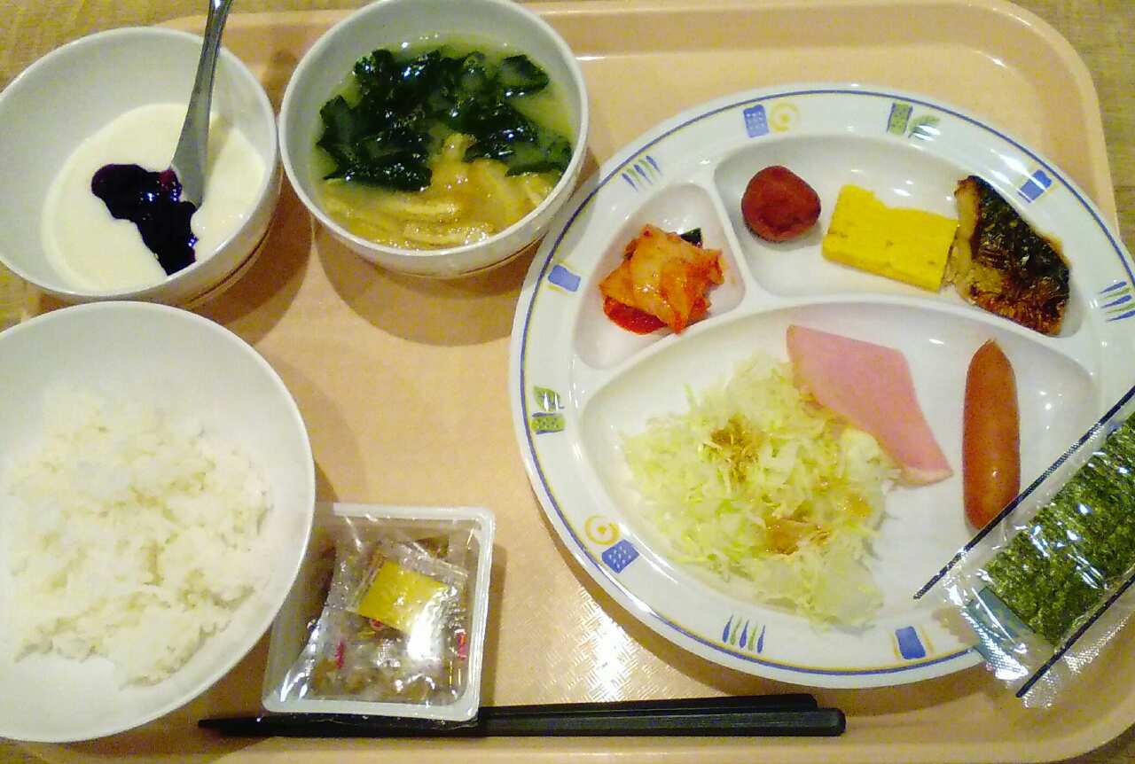 ごくごく普通の朝食ですが、コーヒーもついてるし、味噌汁の具(ワカメと油揚げ)は好きなだけ入れられるし、パンも選べるしヨーグルトもあって、何よりバイキング形式の朝食付きで一泊4800円はお得かなと思いました。