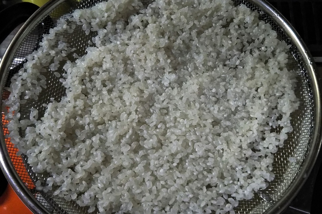 ②米は洗い表面がしっかり乾くまで干す(約30分)。