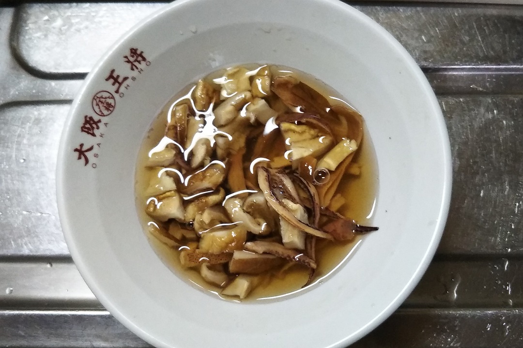 ①干しいたけとスルメは砂糖ひとつまみを加えたぬるま湯で戻し適当な大きさに切る。