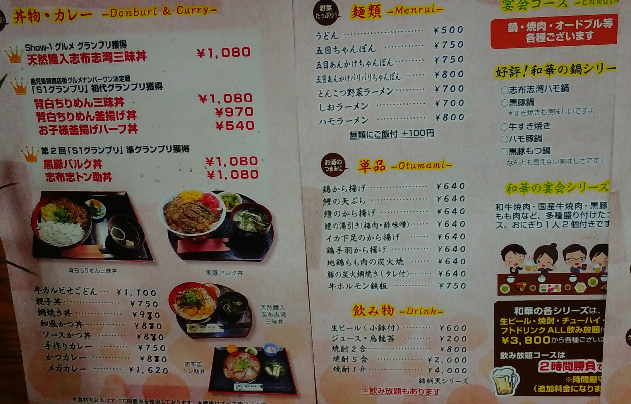 普通の食堂ですが「鹿児島県商店街グルメナンバーワン決定戦」で、グランプリをとったというメニューが勢揃い。