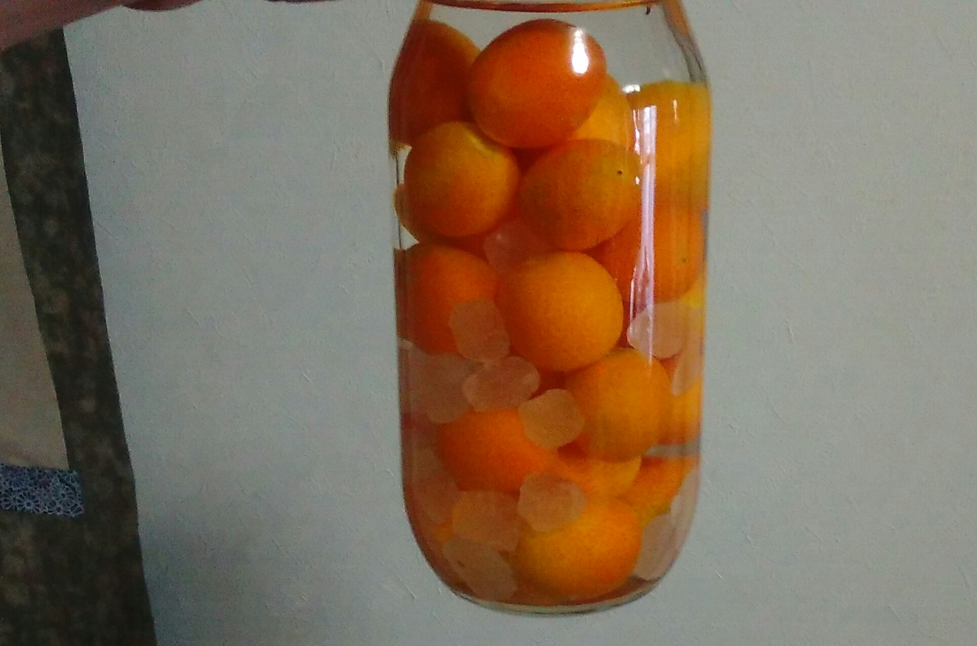 氷砂糖が溶け、金柑が浮き上がって無色透明のホワイトリカーが色づいていますね~♪