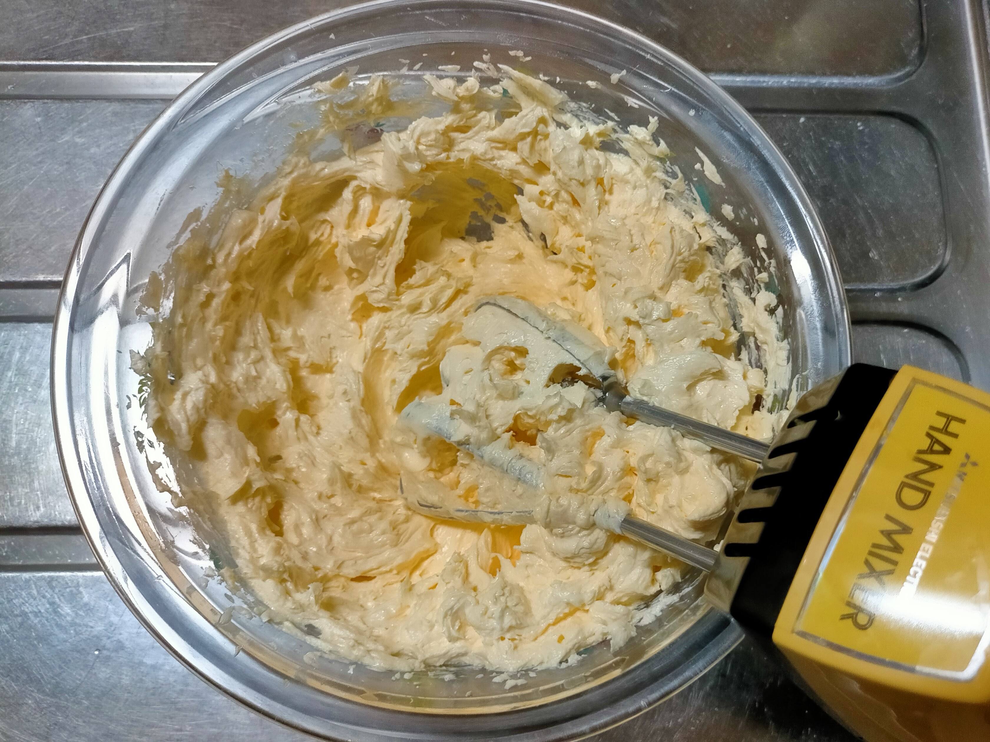 ①ハンドミキサーでバターをホイップし、砂糖を2~3回に分けて入れる。続いて溶き卵を少しずつ入れながら混ぜ続け、水で溶いた重層、生クリーム、バニラエッセンスも入れ混ぜ合せる。
