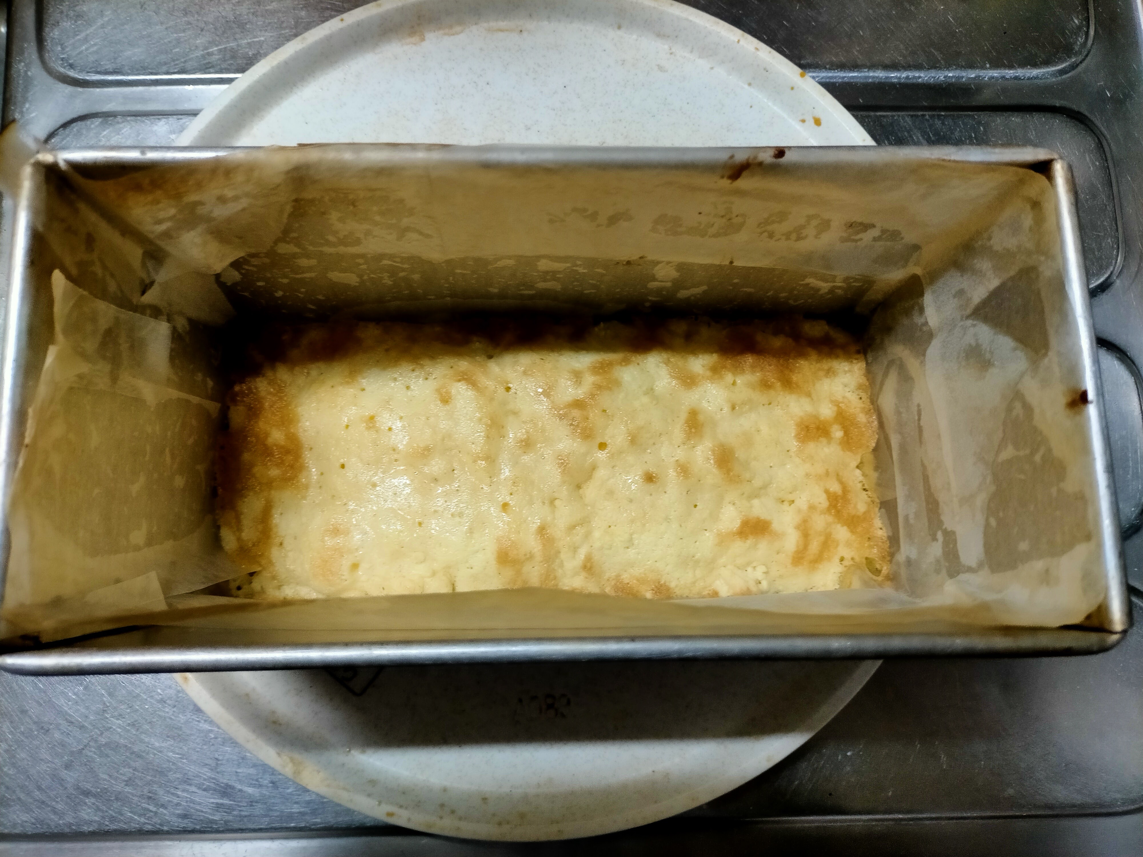 ②薄力粉を入れ、ヘラでサックリ混ぜて完成した生地の1/4ほどを型に入れ、180℃のオーブンで10分焼く。