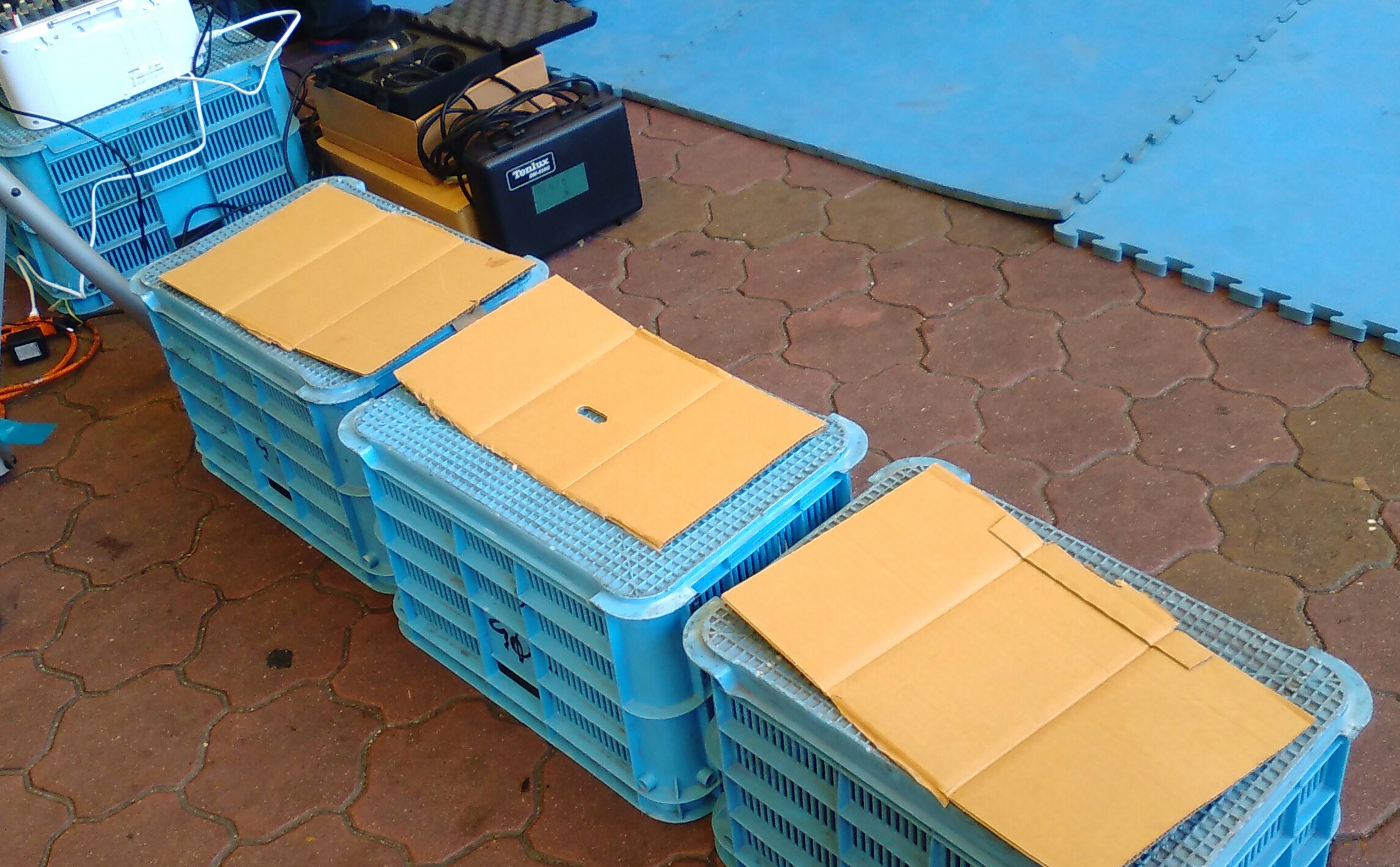 観戦席は八百屋で使っていそうなカゴに段ボールだし(笑)。