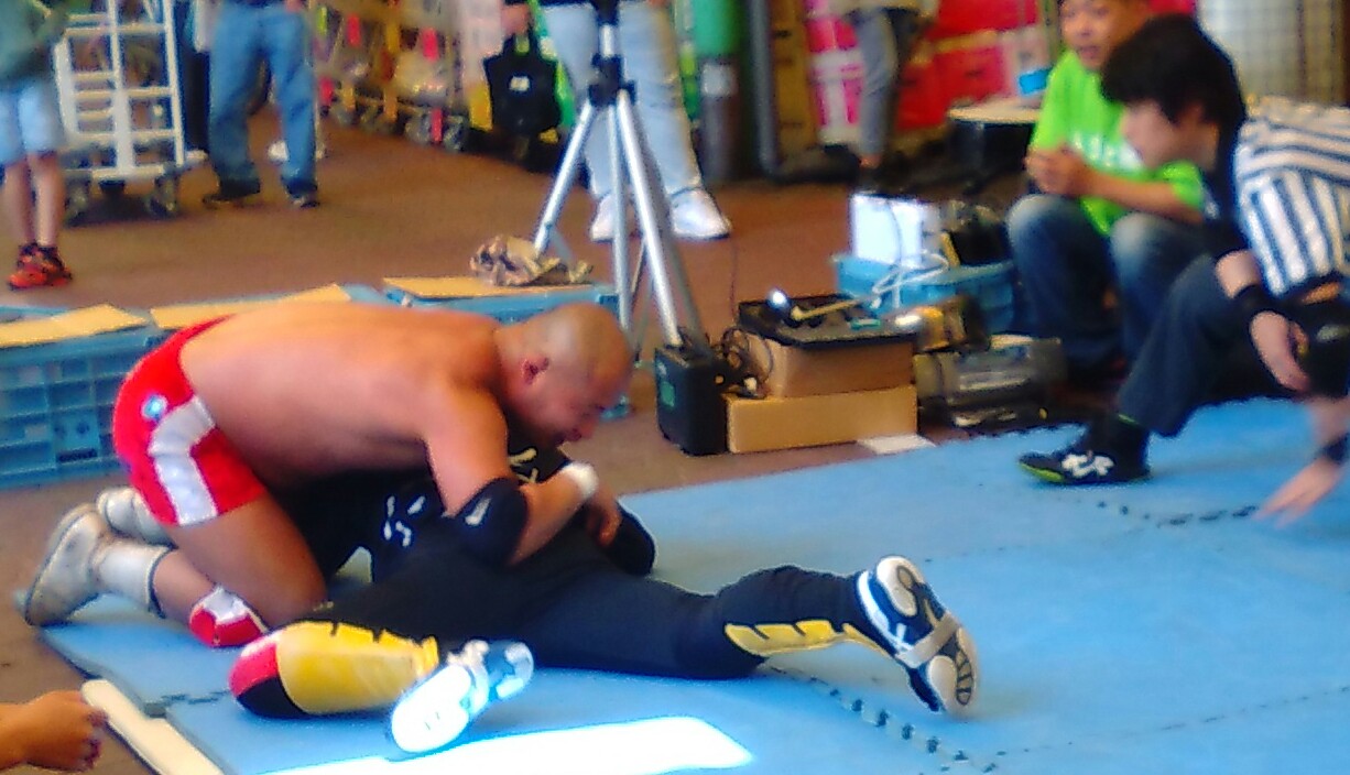 直前までマットでストレッチに余念がなかった城東キッドさん、わざわざ一旦控えに入っての再登場です(笑)。