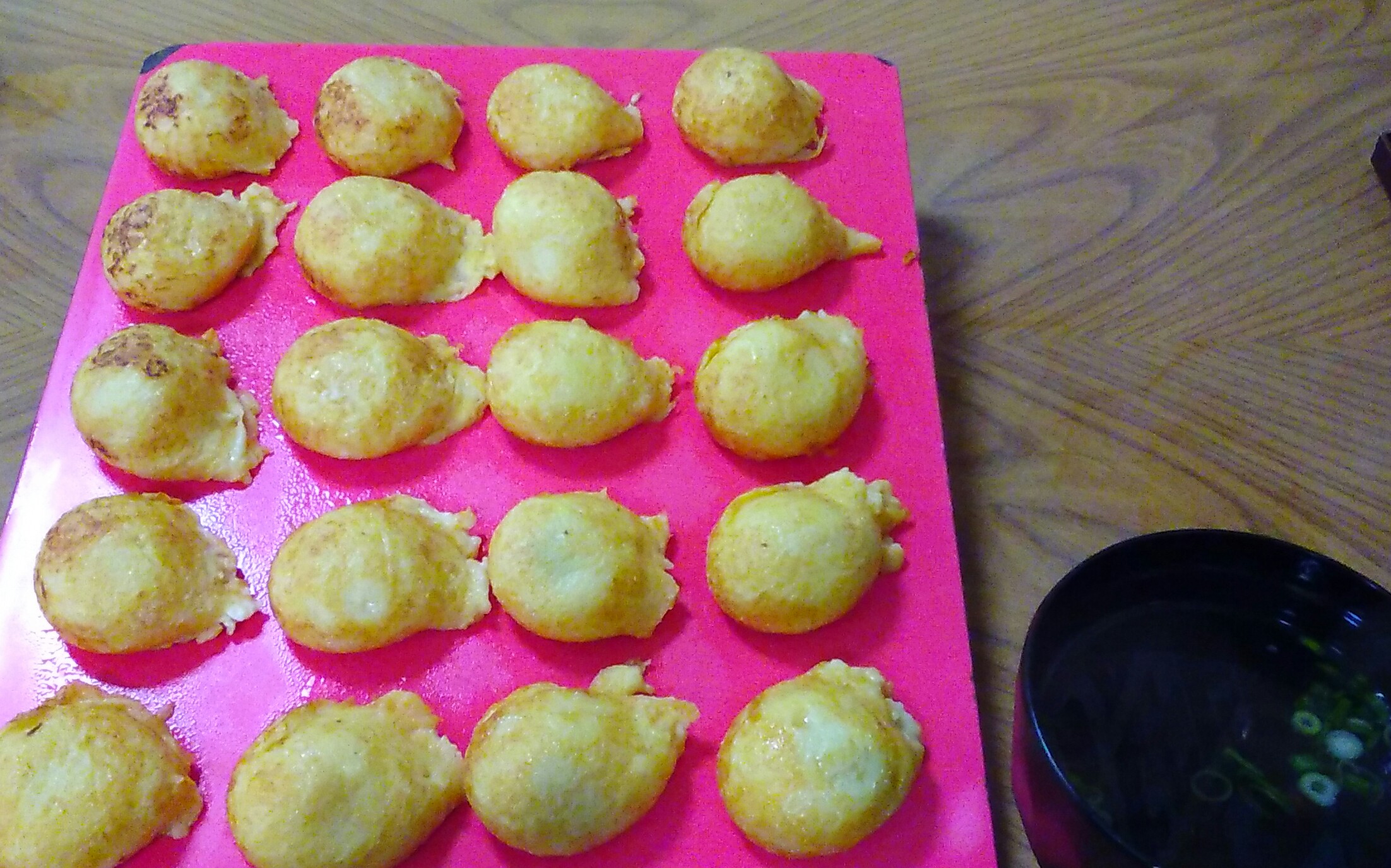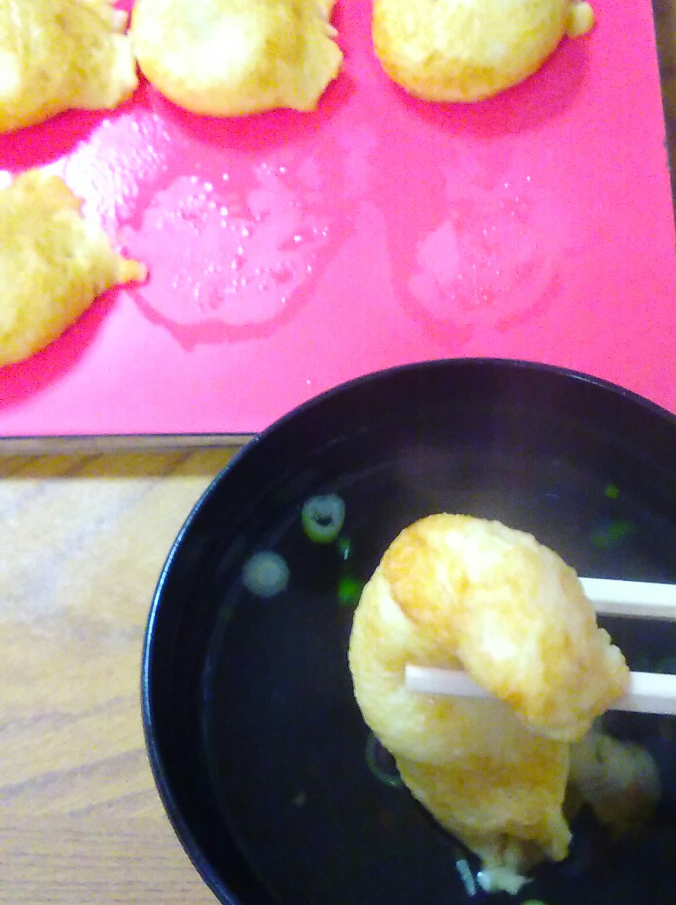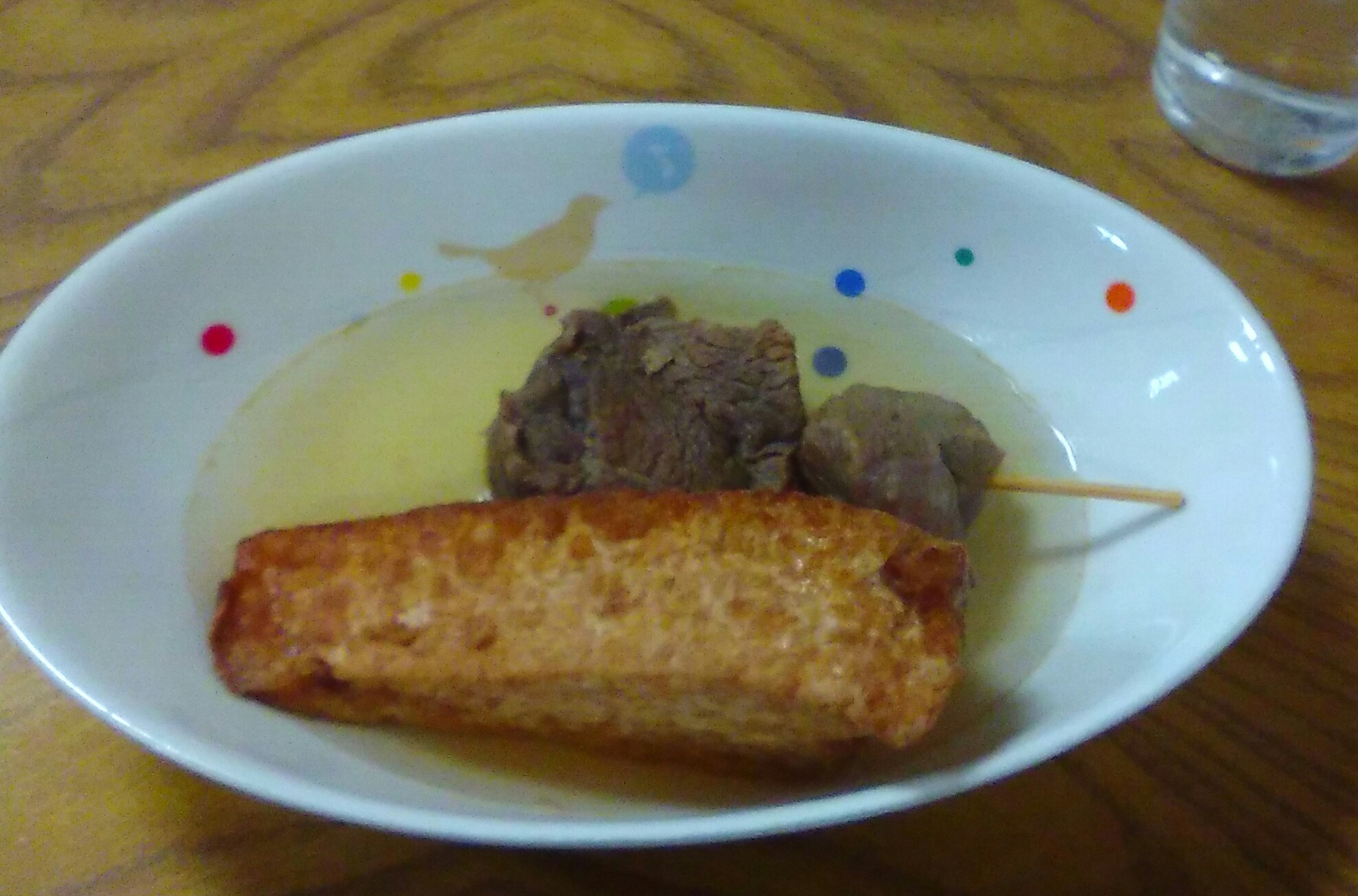 厚揚げ(150円)と、すじ(250円)を食べながら明石焼きが焼けるのを待ちます。