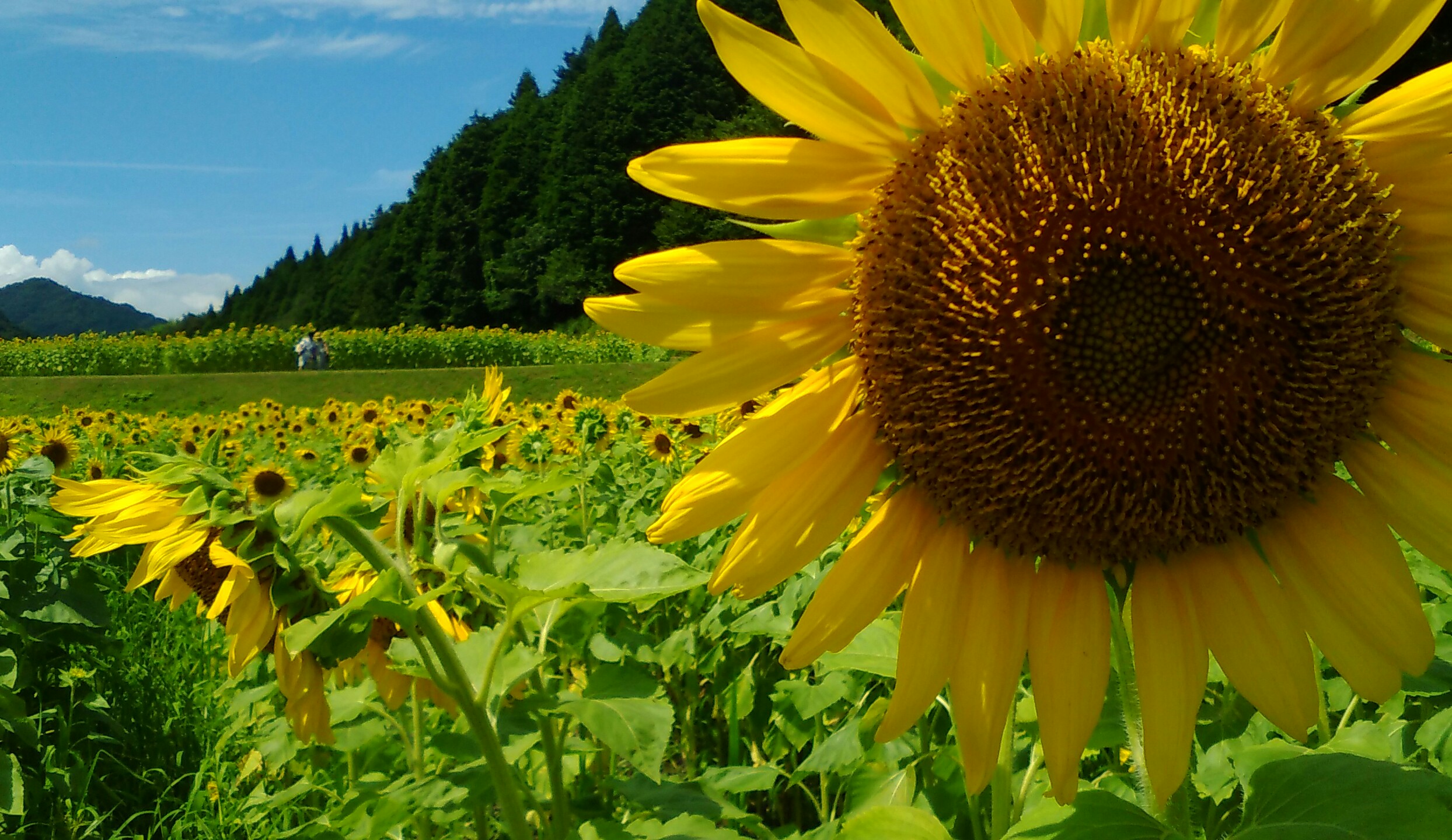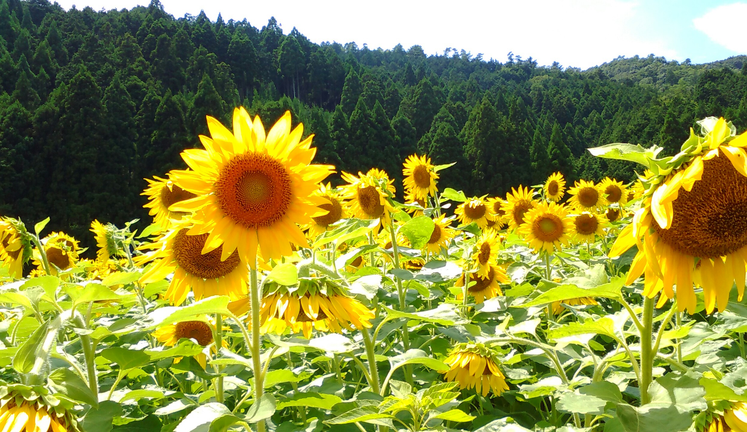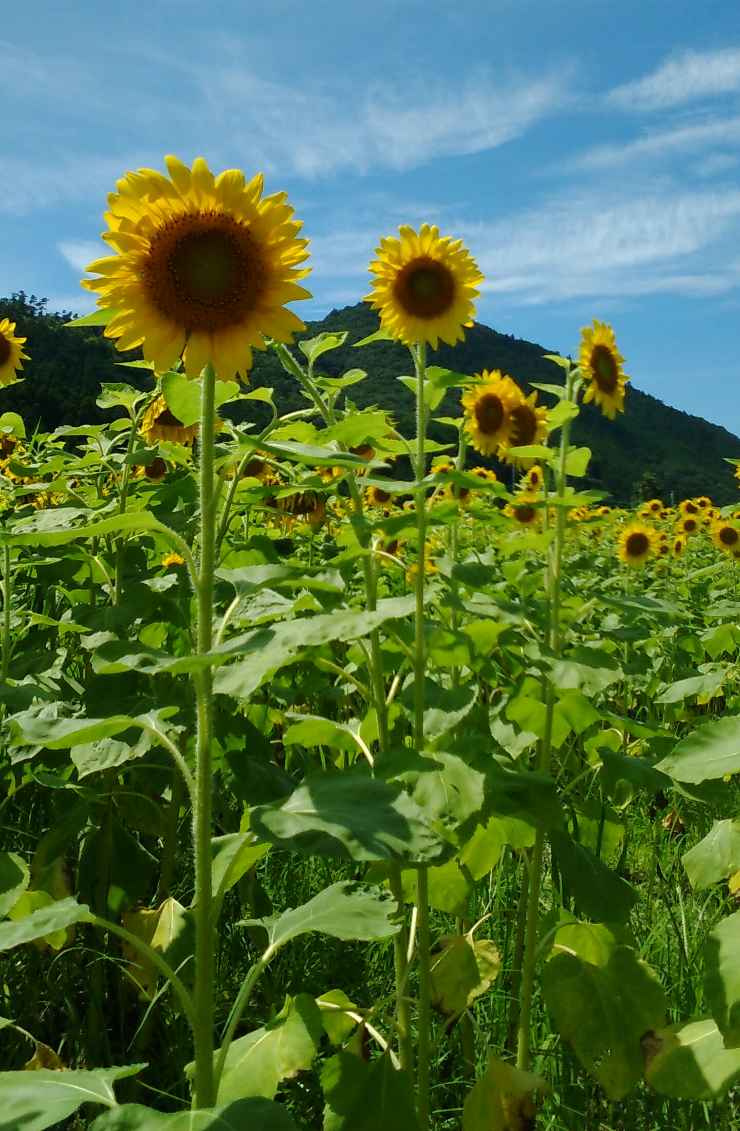 ひまわりの高さは思ったほど高くなく(高いもので背丈くらい)、規模も、一面のひまわり畑というほどではなかったけど、青い空、緑の山をバックにした黄色いひまわり畑の美しさは、苦労して見に来た甲斐がありました。