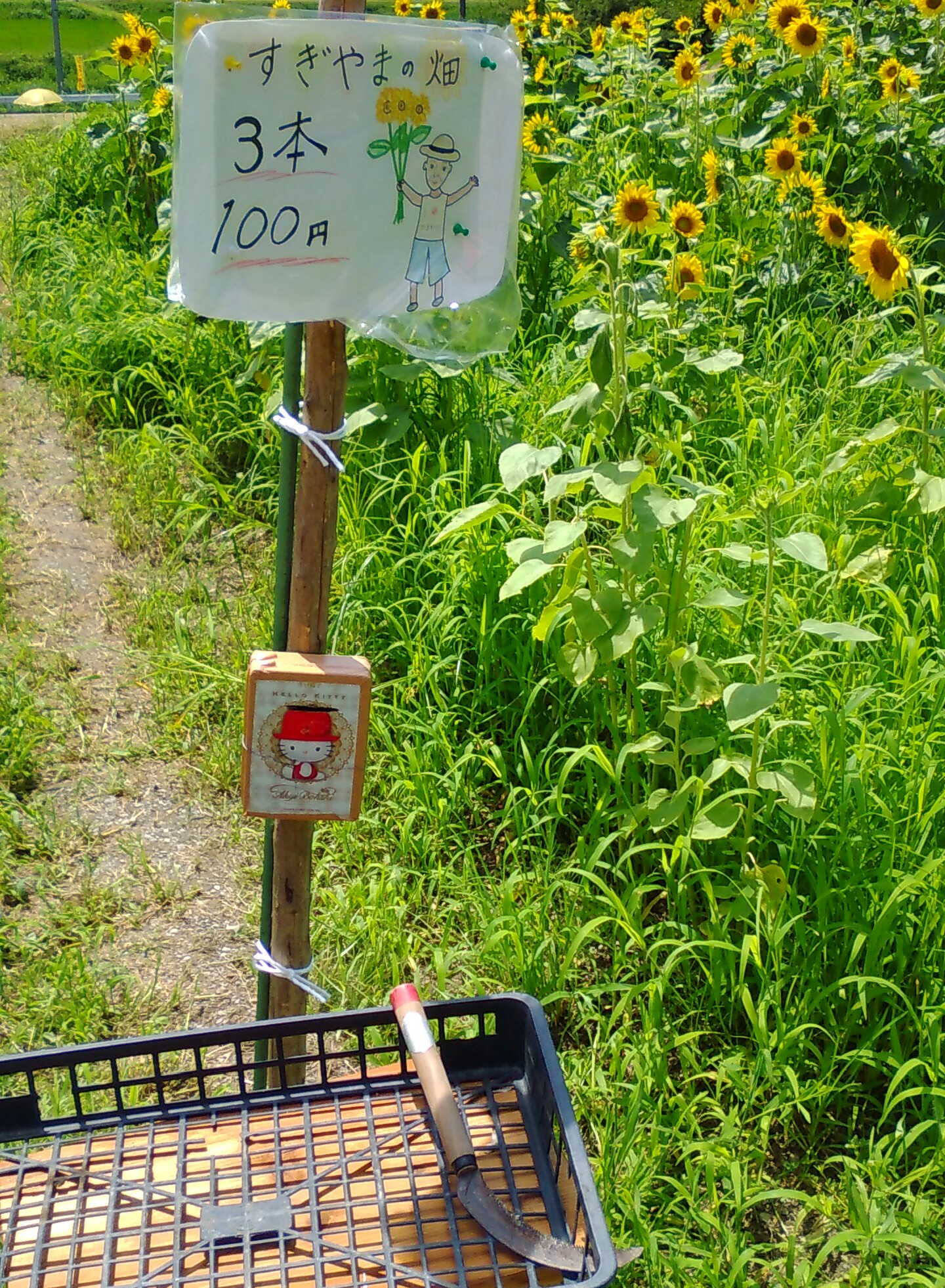 ところどころに、こうした立て看板と鎌が置かれてあり、ひまわりを手に歩くカップルや家族連れの姿が。