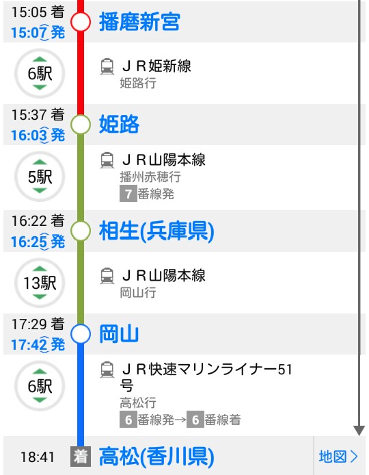 姫路で乗り換え、相生で乗り換え岡山からマリンライナーへ乗りこんだあたりではもうクタクタ。