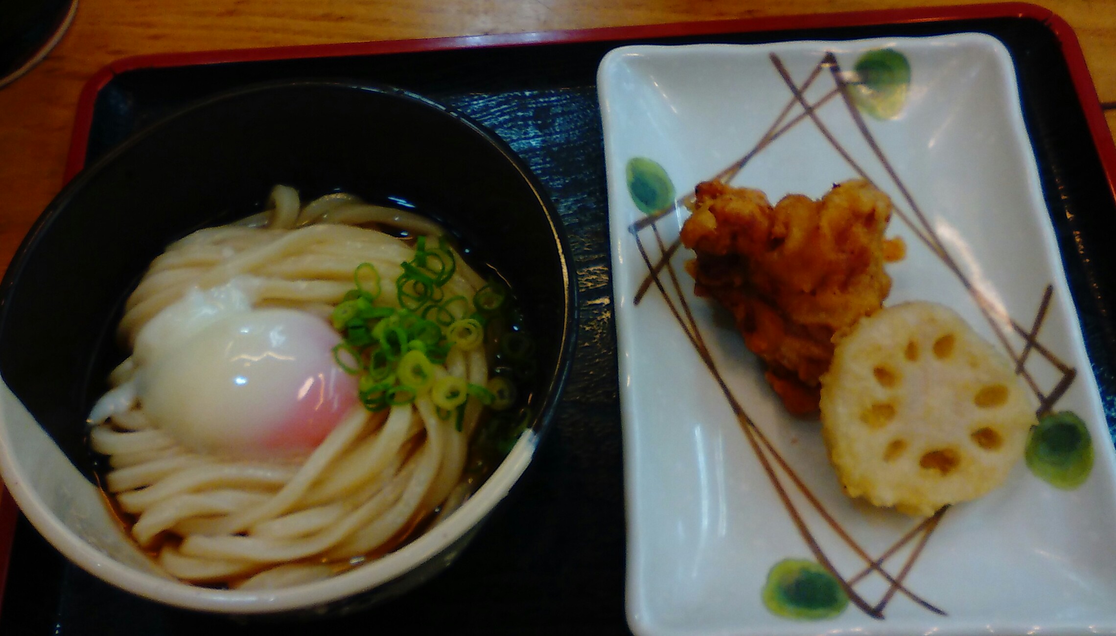 冷しうどんに温泉卵を乗せ、レンコン天と鶏の唐揚げを注文。510円なり。