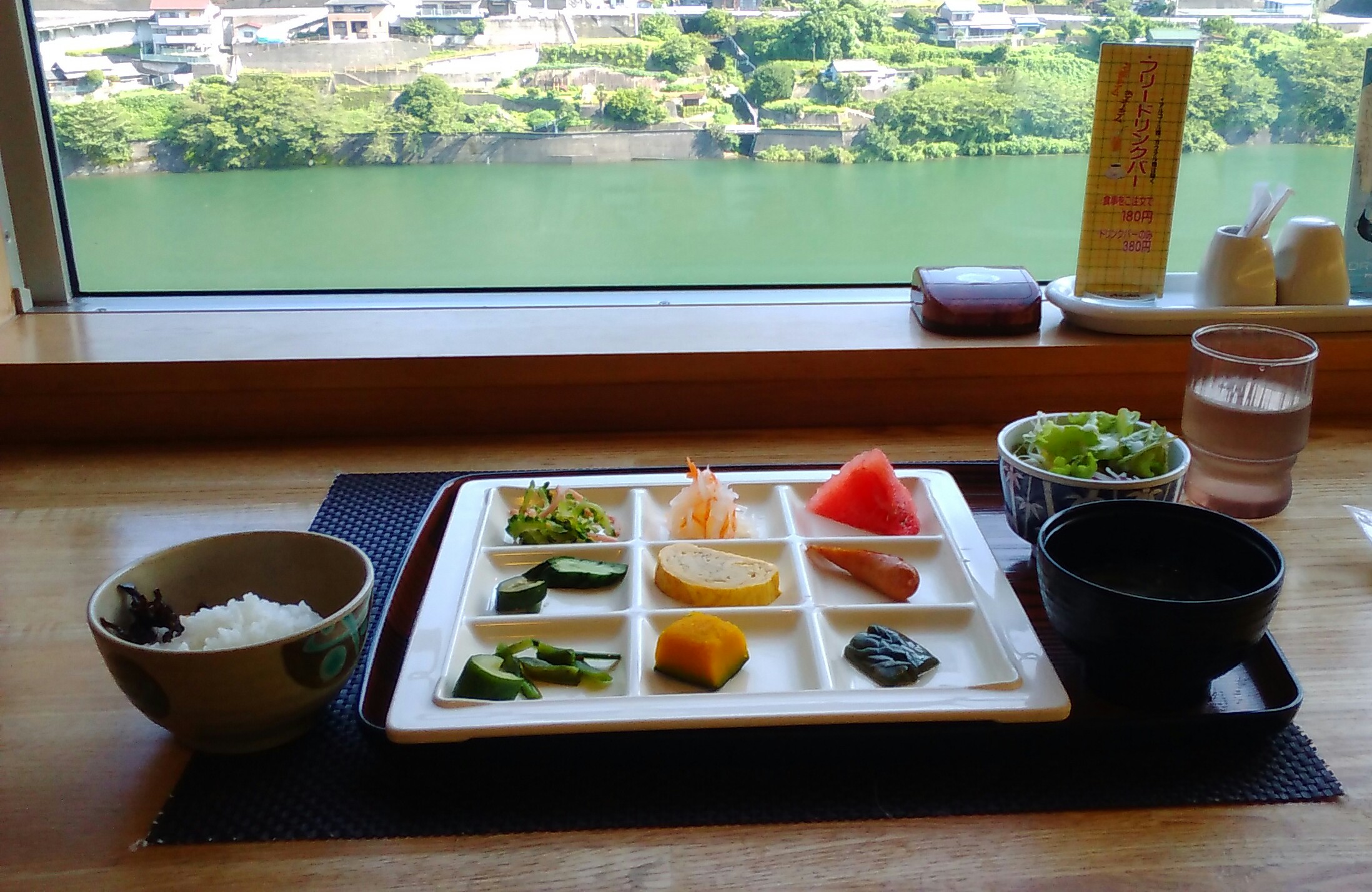 500円を払い、お総菜や味噌汁を盛って、吉野川を目の前に見られるカウンター席に座りました。