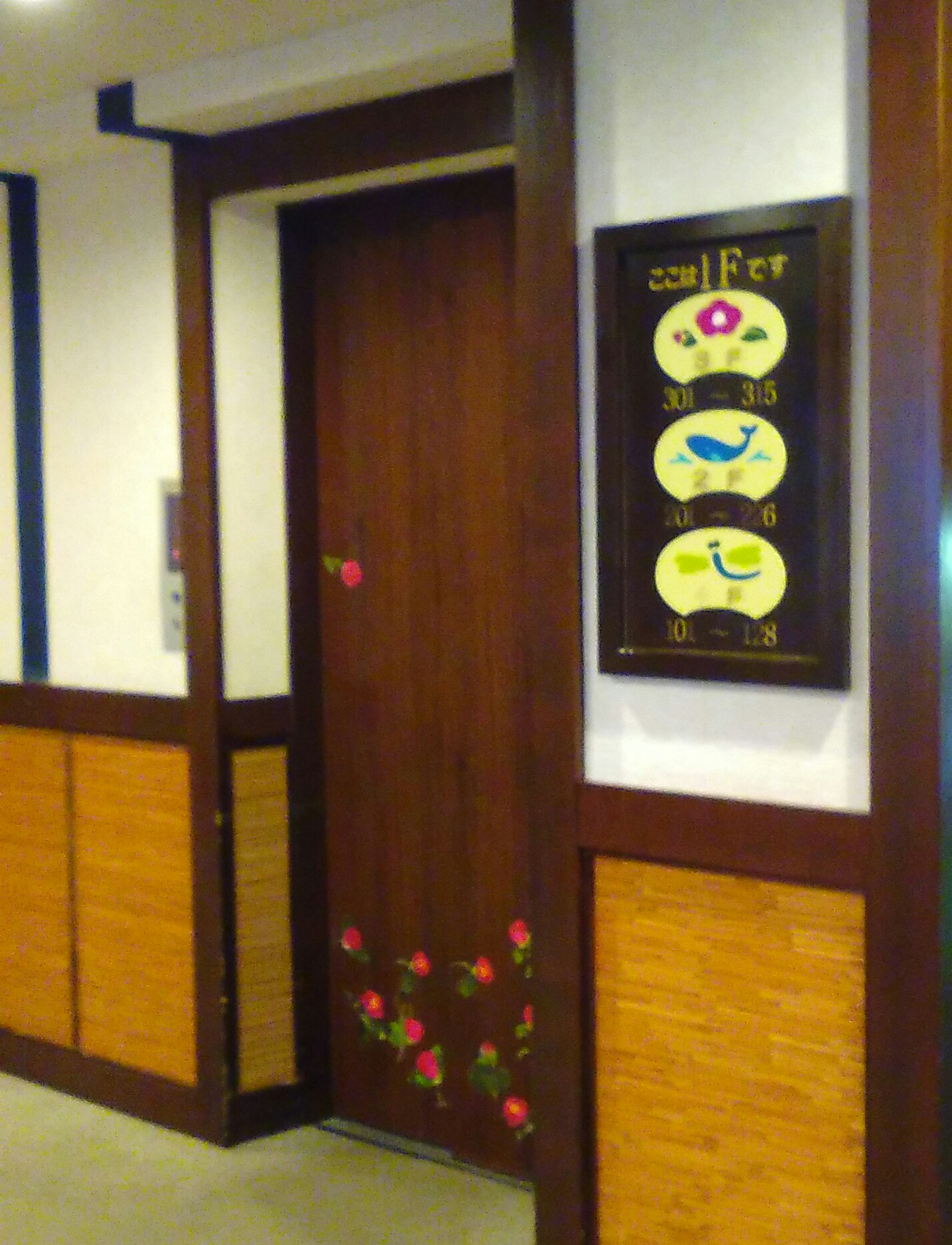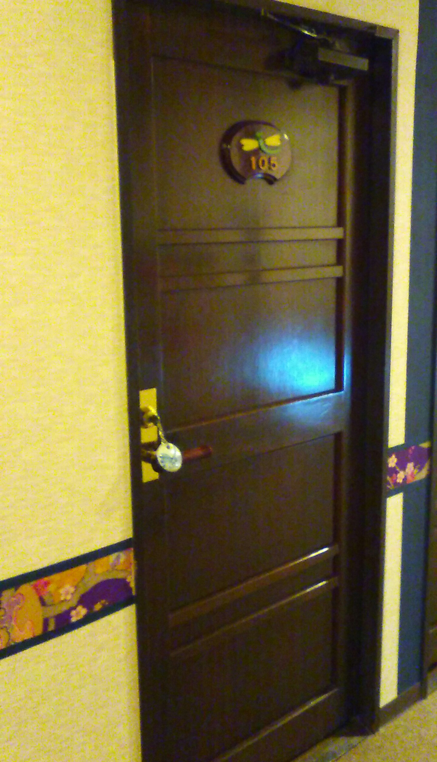 客室のドアも、ルームキーとお揃いの絵柄が入っています。