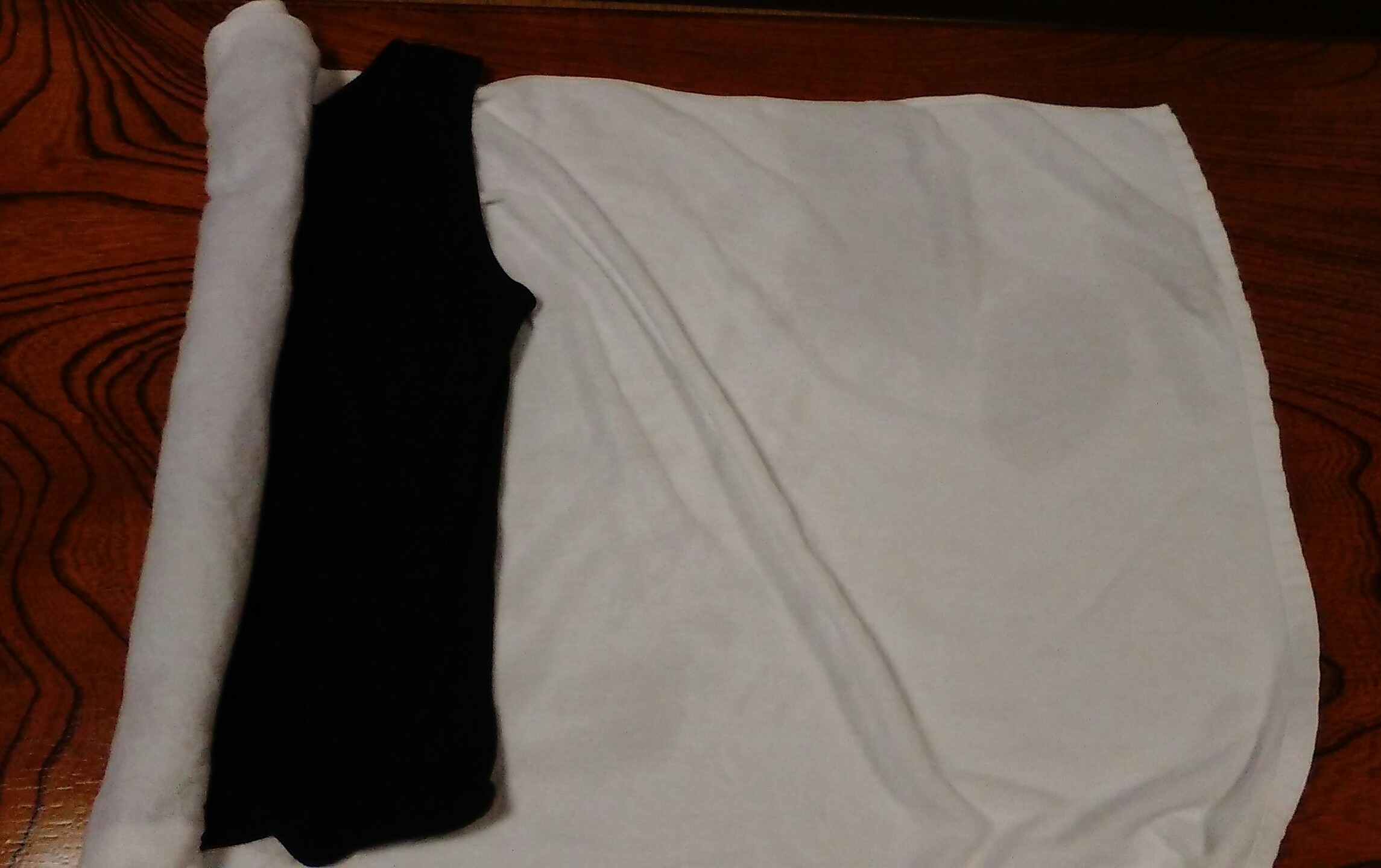 バスタオルを広げて手で絞った洗濯物を置き、端からクルクル巻きにします。