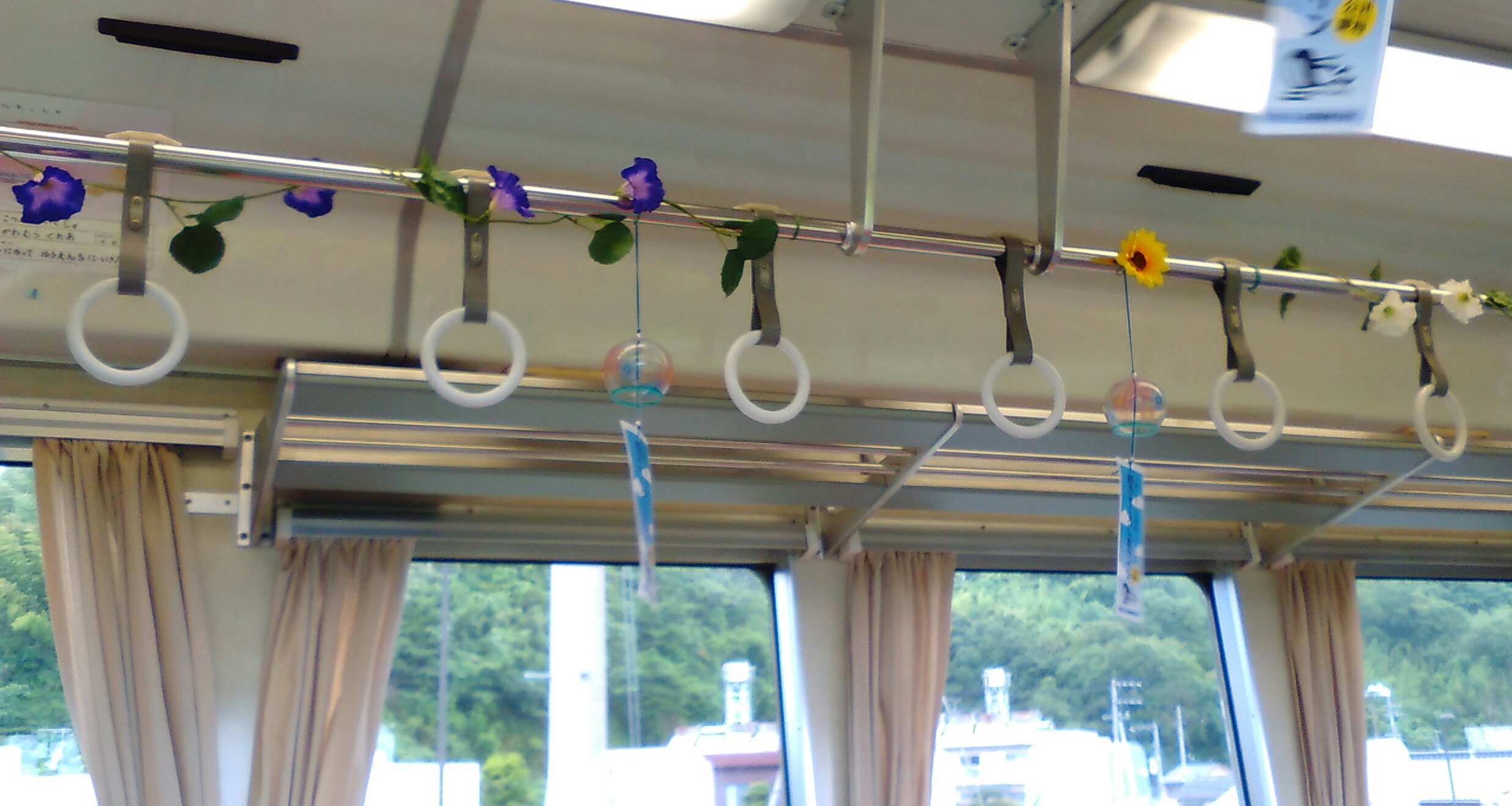 駅で止まりドアが開いて車内に風が吹き込むと、それまで静かに揺れていた風鈴が煽られ一斉に鳴りだします。