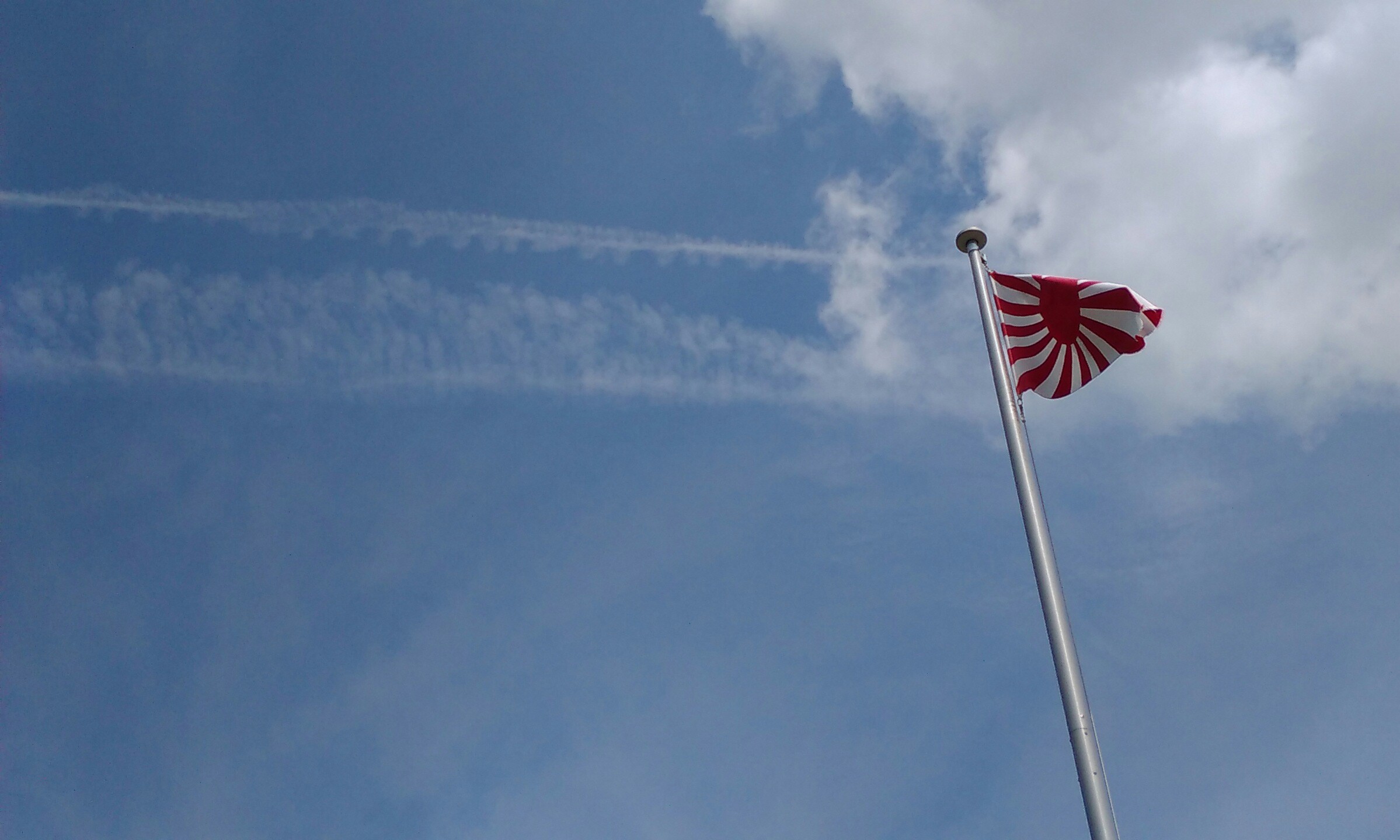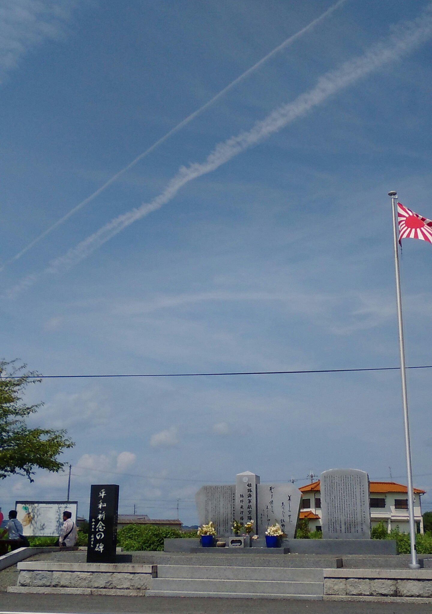 旗のうしろの飛行機雲が嫌でも当時を連想させます。