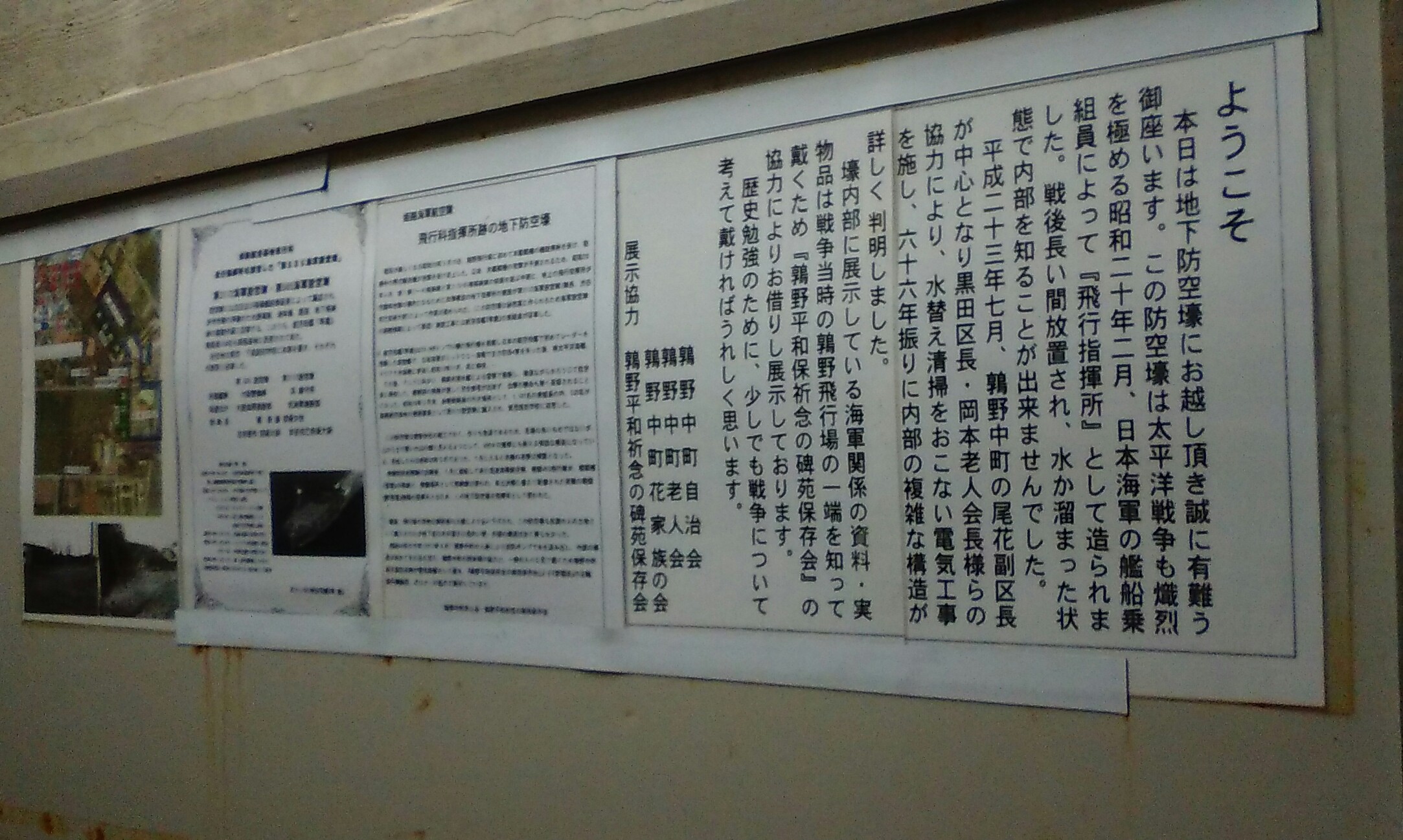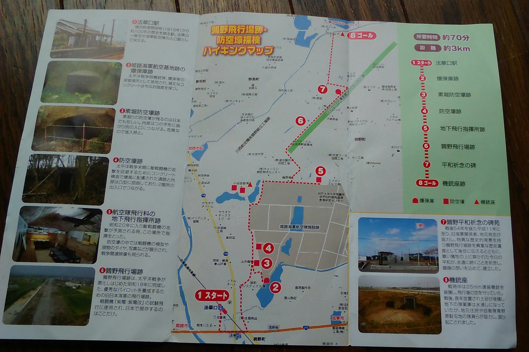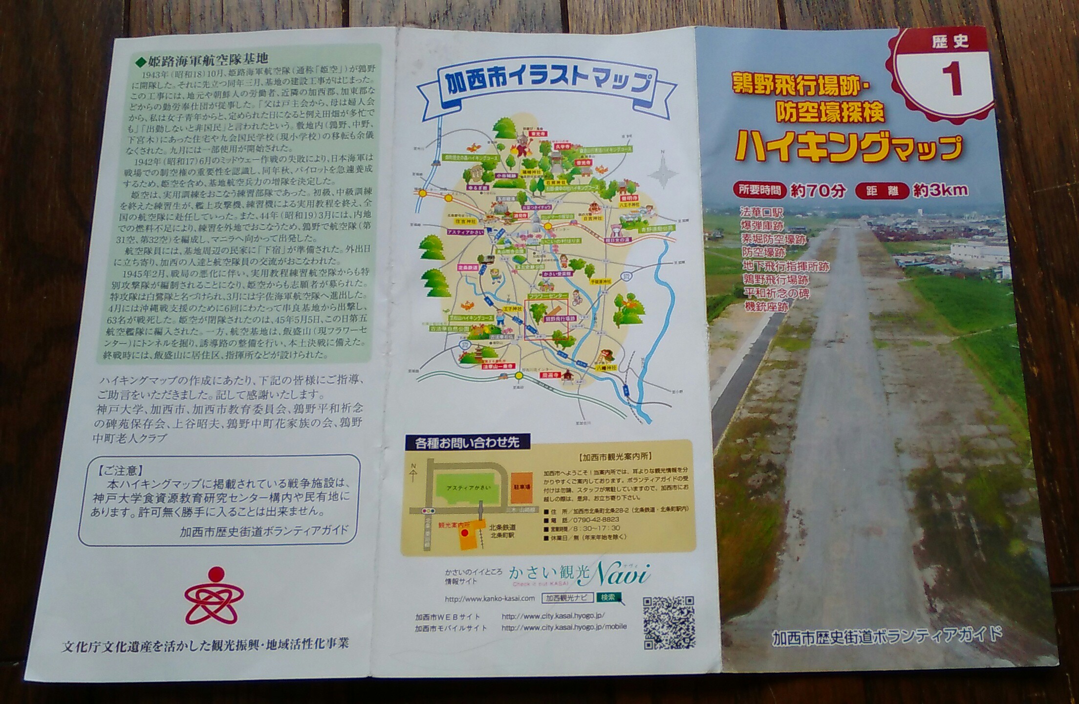 試験飛行のための滑走路や地下指揮所、防空壕、機銃座などを見ることができますが、ハイキングマップに掲載されている施設に入るには許可が必要とのことなので、加西市の「加西観光ナビ」のホームページで調べた問い合わせ先に連絡し、ボランティアガイドを申し込みました。