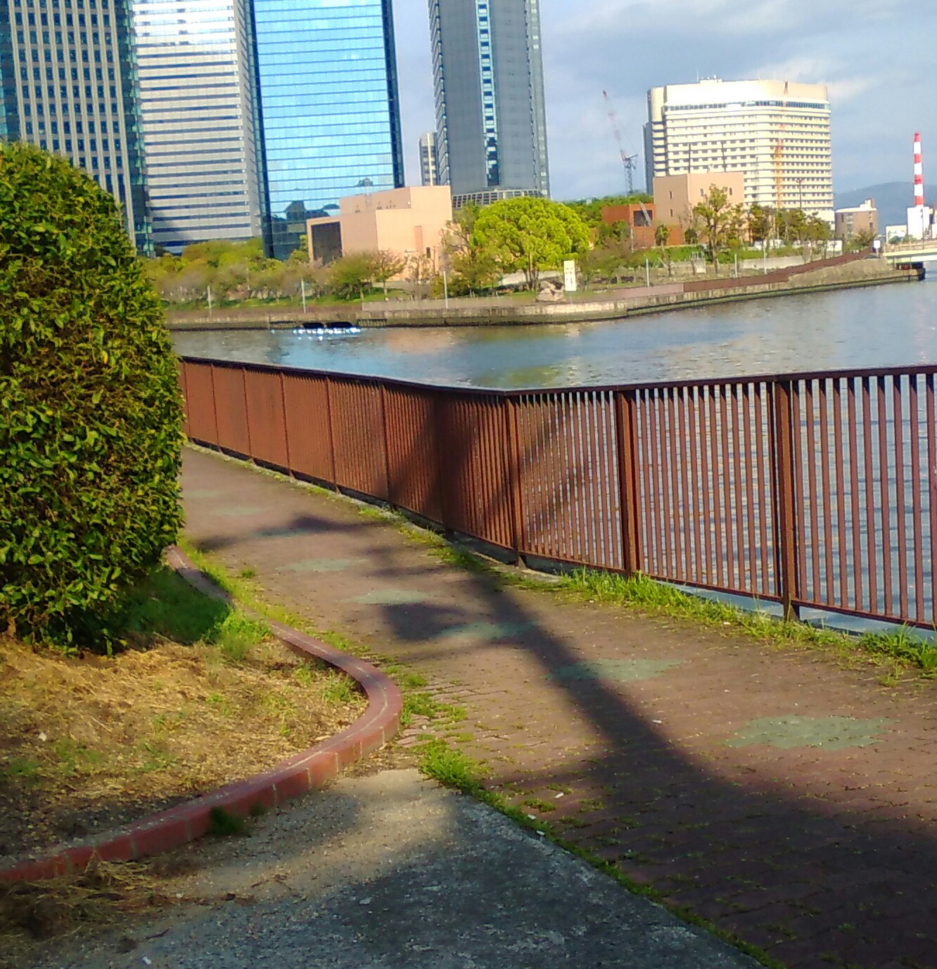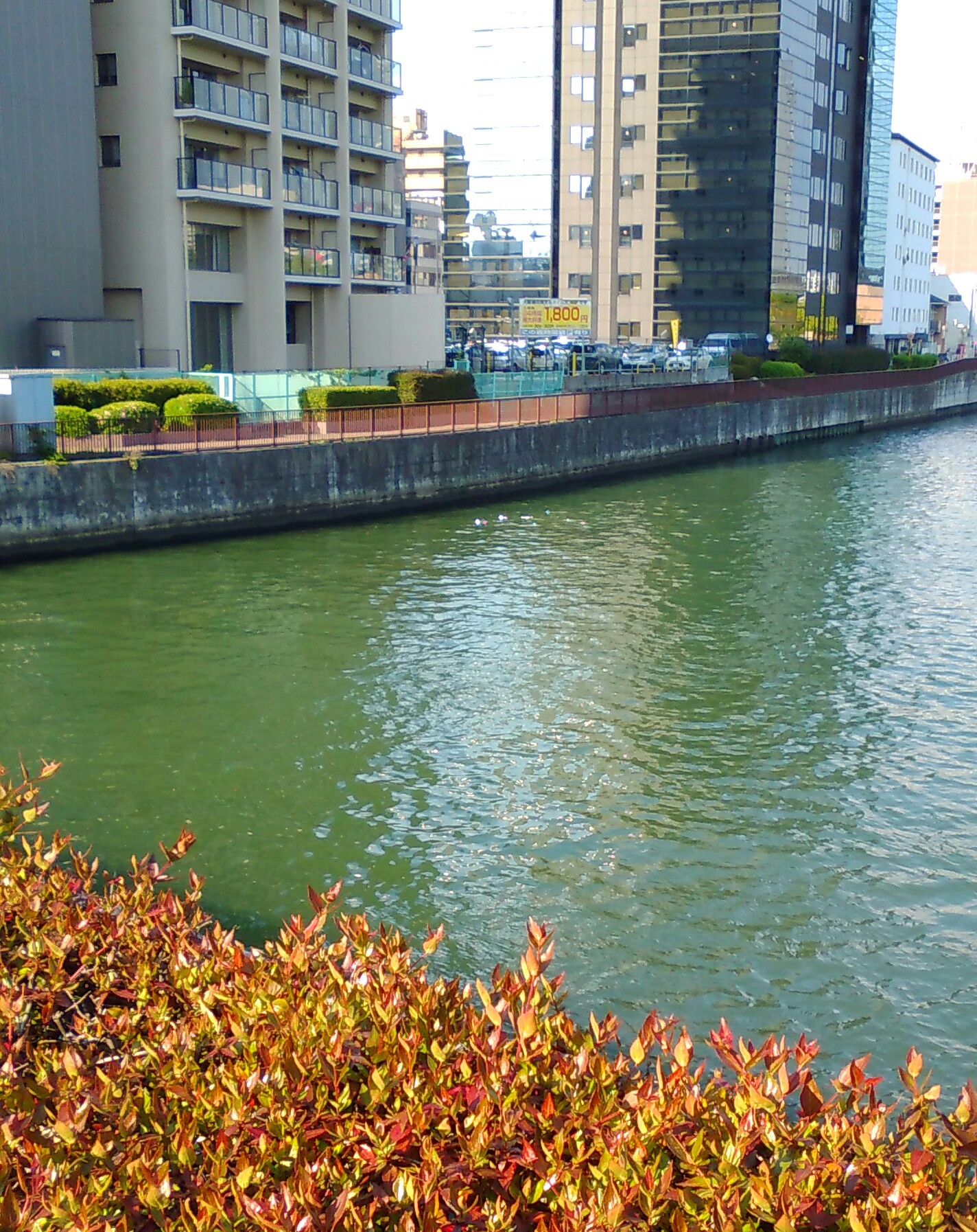 いつもぼんやり外堀を眺めながらの帰り道なのですが、この日、寝屋川にかかる京橋を土佐堀通りに向かって歩いていたとき、水面が小さく光っています。