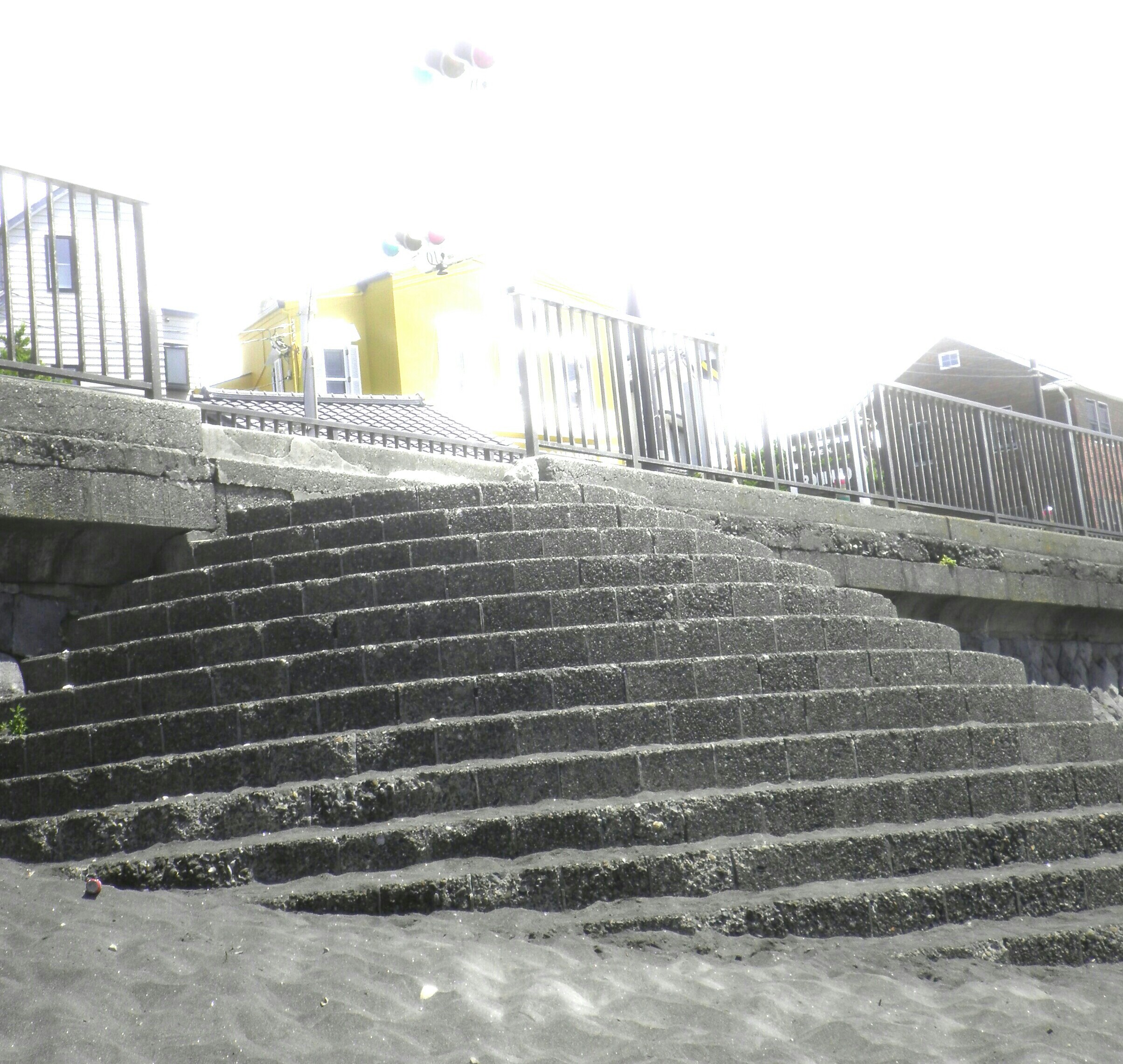 この横断歩道を渡って、海岸に降りる丸階段を下からみた光景がこれ。