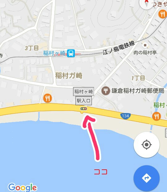稲村ヶ崎駅から海岸へ出る横断歩道に到着。