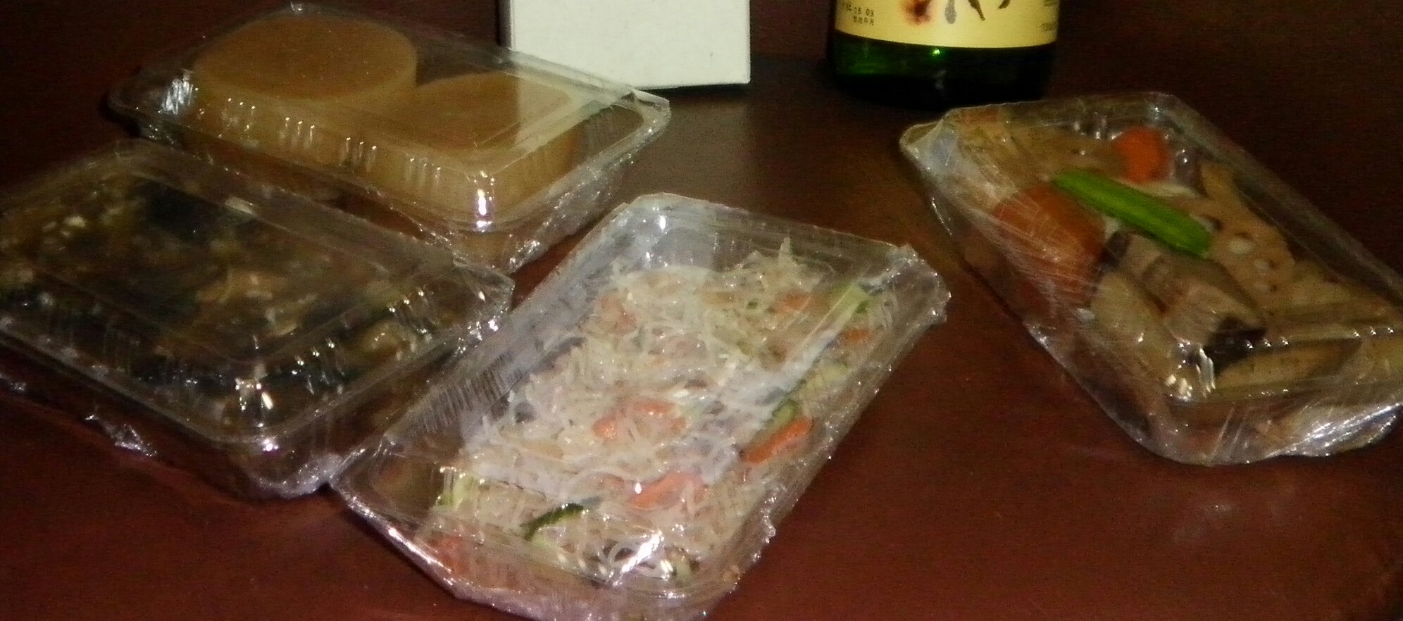 いくつかあったお惣菜の中で選んだ麻婆茄子、大根煮、春雨サラダ、筑前煮の4パック。
