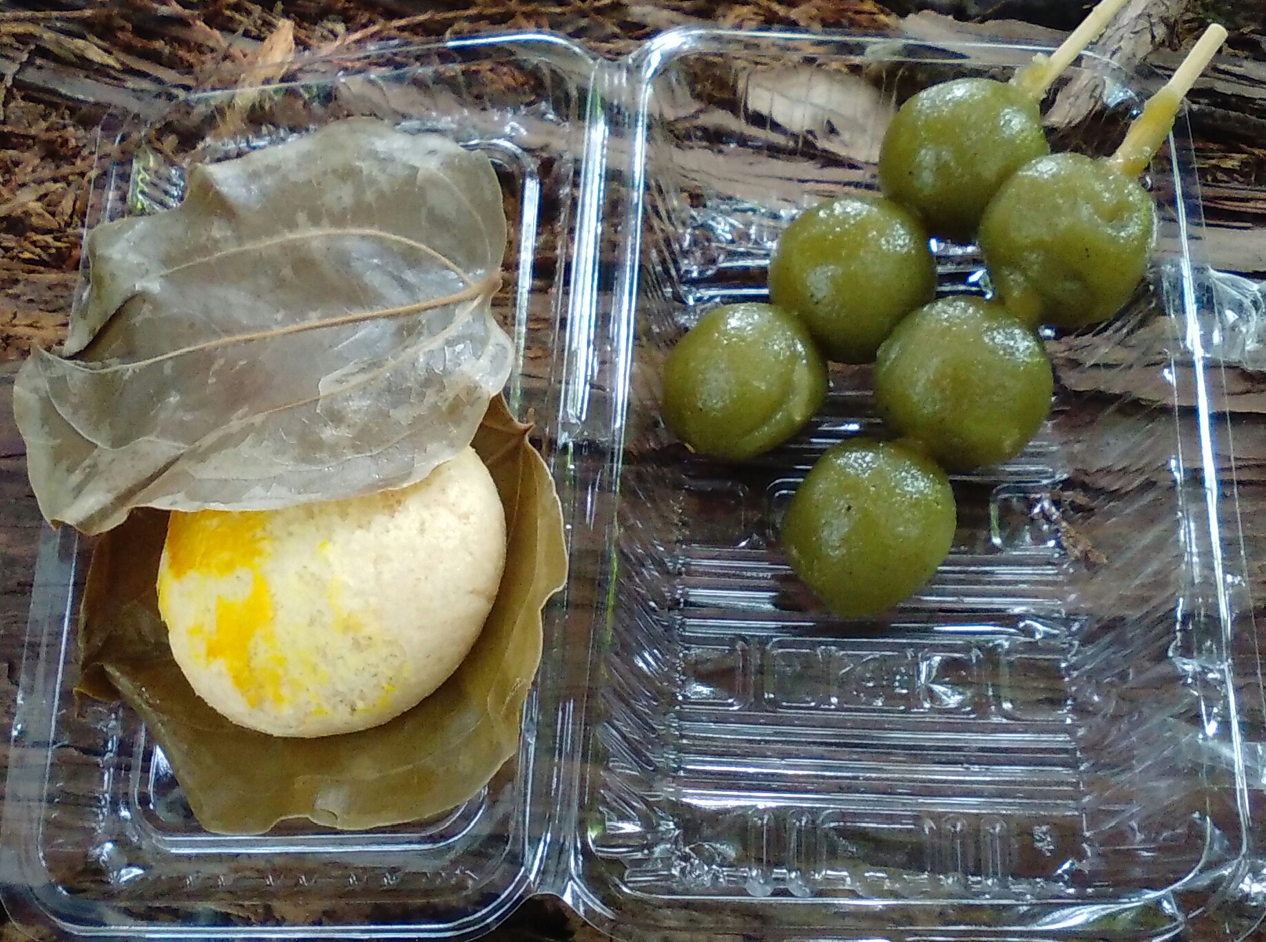 まずは茶団子と、さんきらの葉で包んで蒸されたお饅頭。