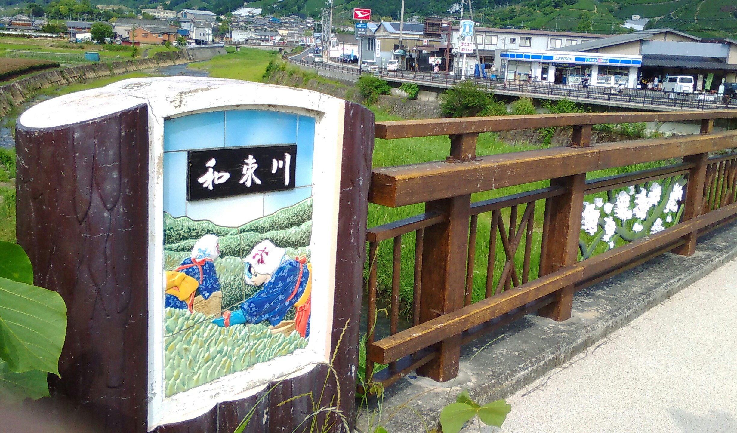 橋の欄干に茶摘みの図柄のタイルがはめ込まれています。