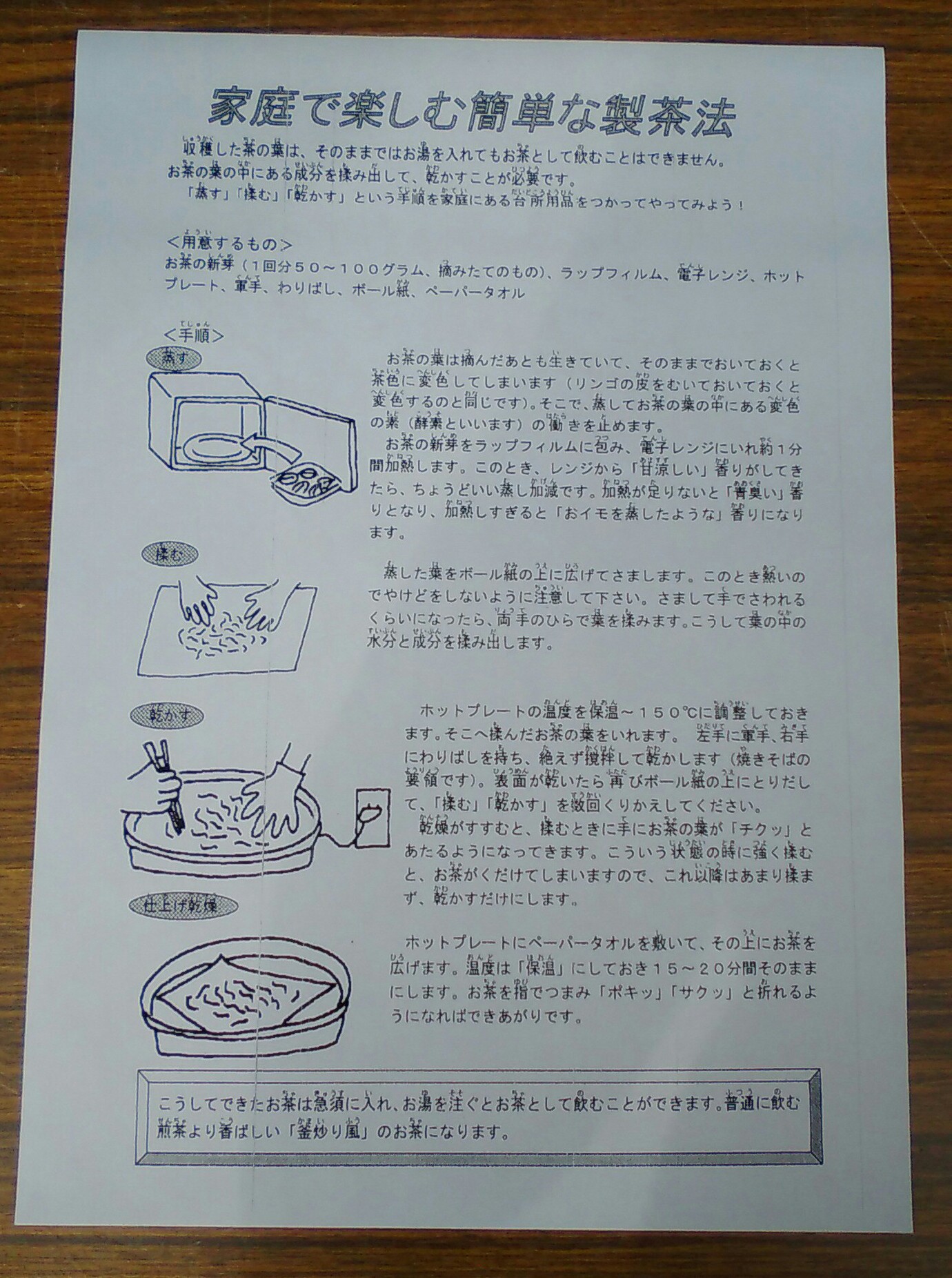 ガイドのお兄さんとしゃべりながら和束茶カフェの前に戻り、製茶方法が書かれた紙をもらいました。