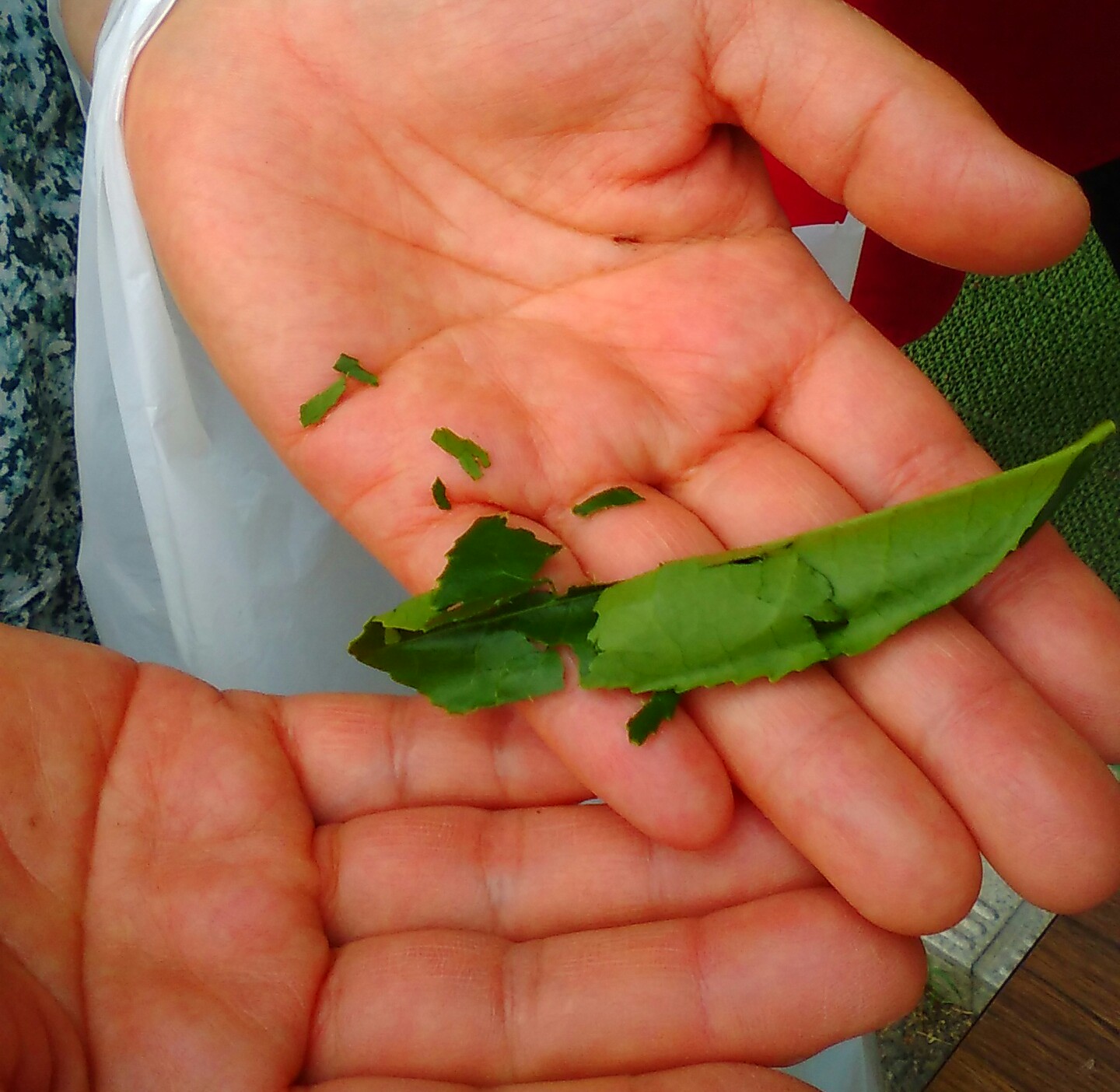 T子ちゃんが摘みたての葉を揉むと