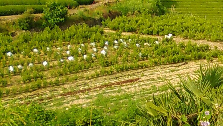ところどころに立てられている白い棒の先には扇風機がゆる~くまわっており、霜がおりるのを防ぐのだとか。