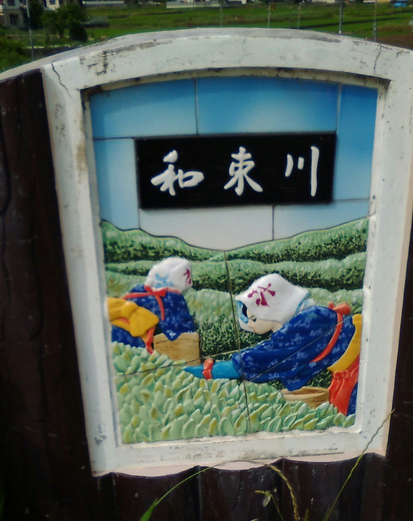 橋の欄干に茶摘みの図柄のタイルがはめ込まれています。