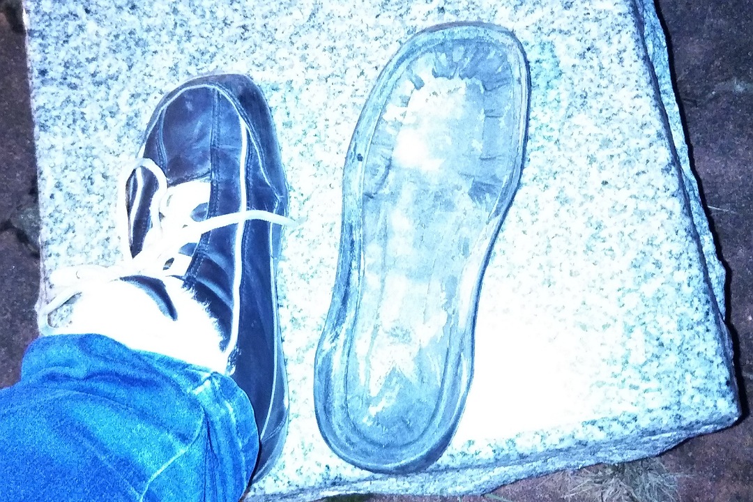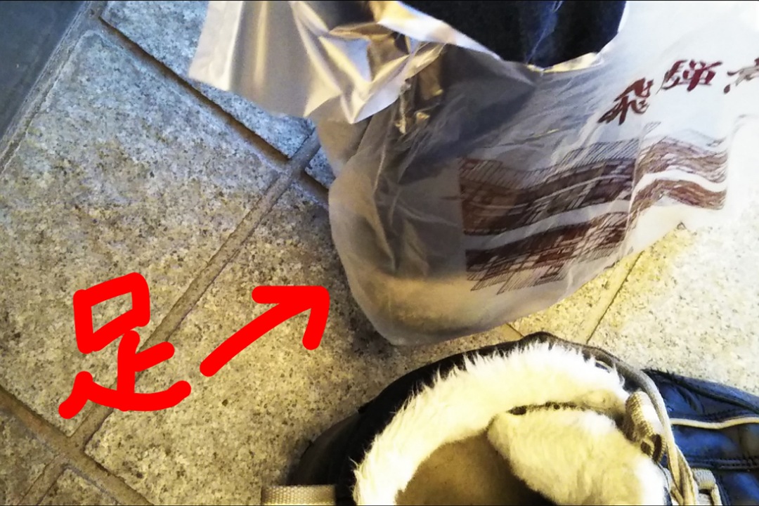 そこで、買い物袋を靴下のように足に履き、その上から靴を履いて何とか乗り切りました。