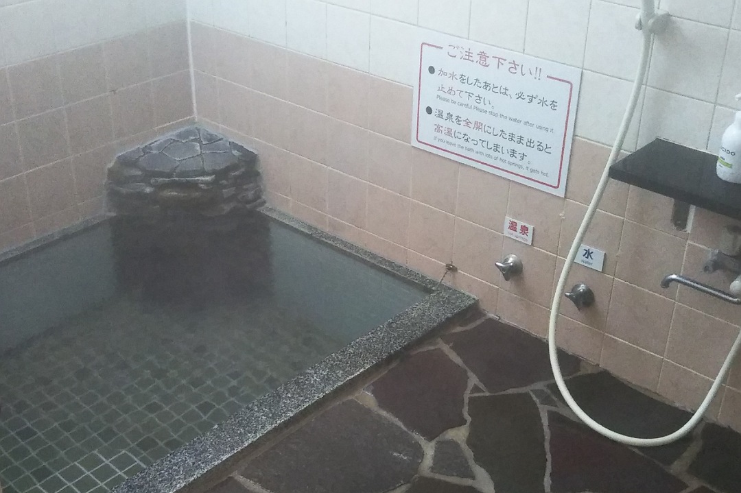 打たせ湯や箱蒸し風呂もあり、ぬるめの湯。