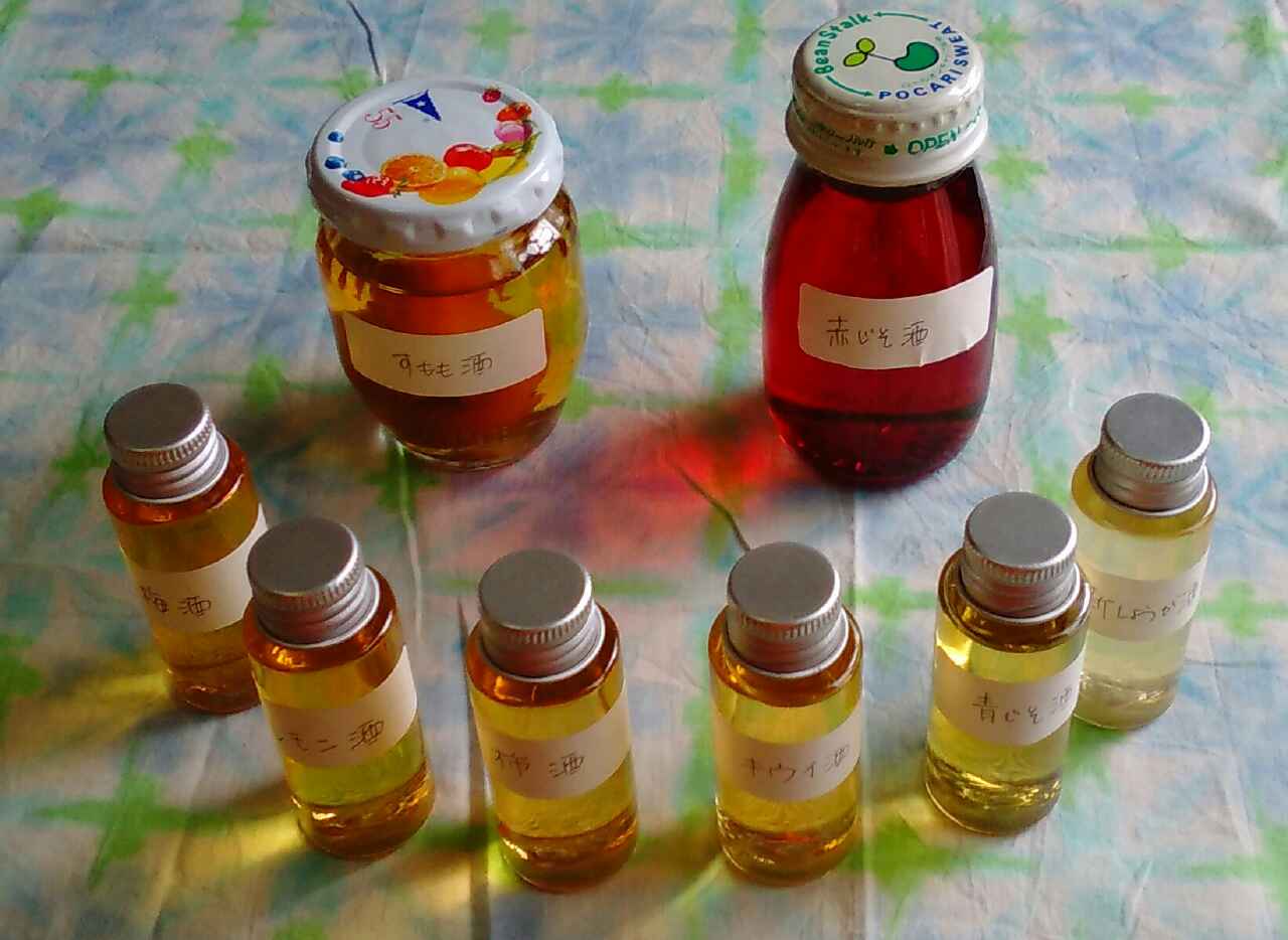 すもも酒、赤じそ酒、梅酒、柿酒、レモン酒、キウイ酒、青ジソ酒、新しょうが酒の8酒を小瓶に詰め替え持参しました。