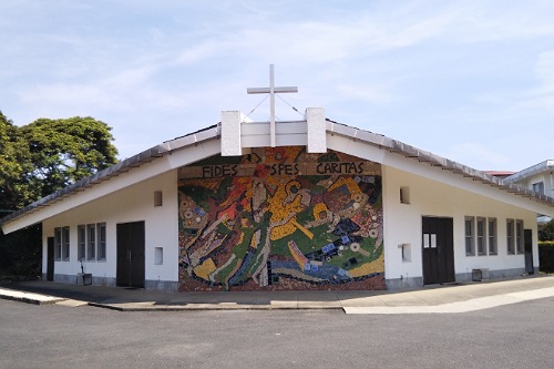 コンクリート造りで正面が鮮やかなモザイクで彩られています。