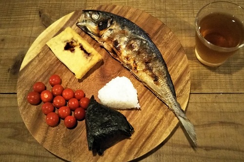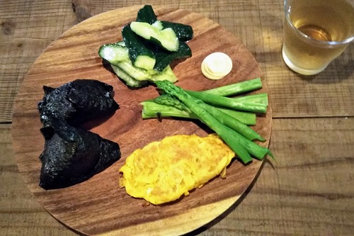 この日の夕飯はおにぎりと玉子焼きとアスパラとやみつききゅうり。