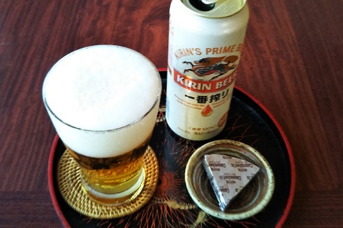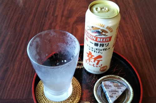 グラスは冷凍庫から出したてでキンキンに冷えてるし、おつまみチーズまで。