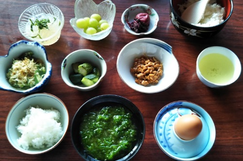 アオサたっぷりの味噌汁に納豆、オクラ。