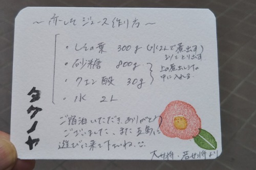 椿のスタンプを押した手作りカードに赤紫蘇ジュースレシピ。