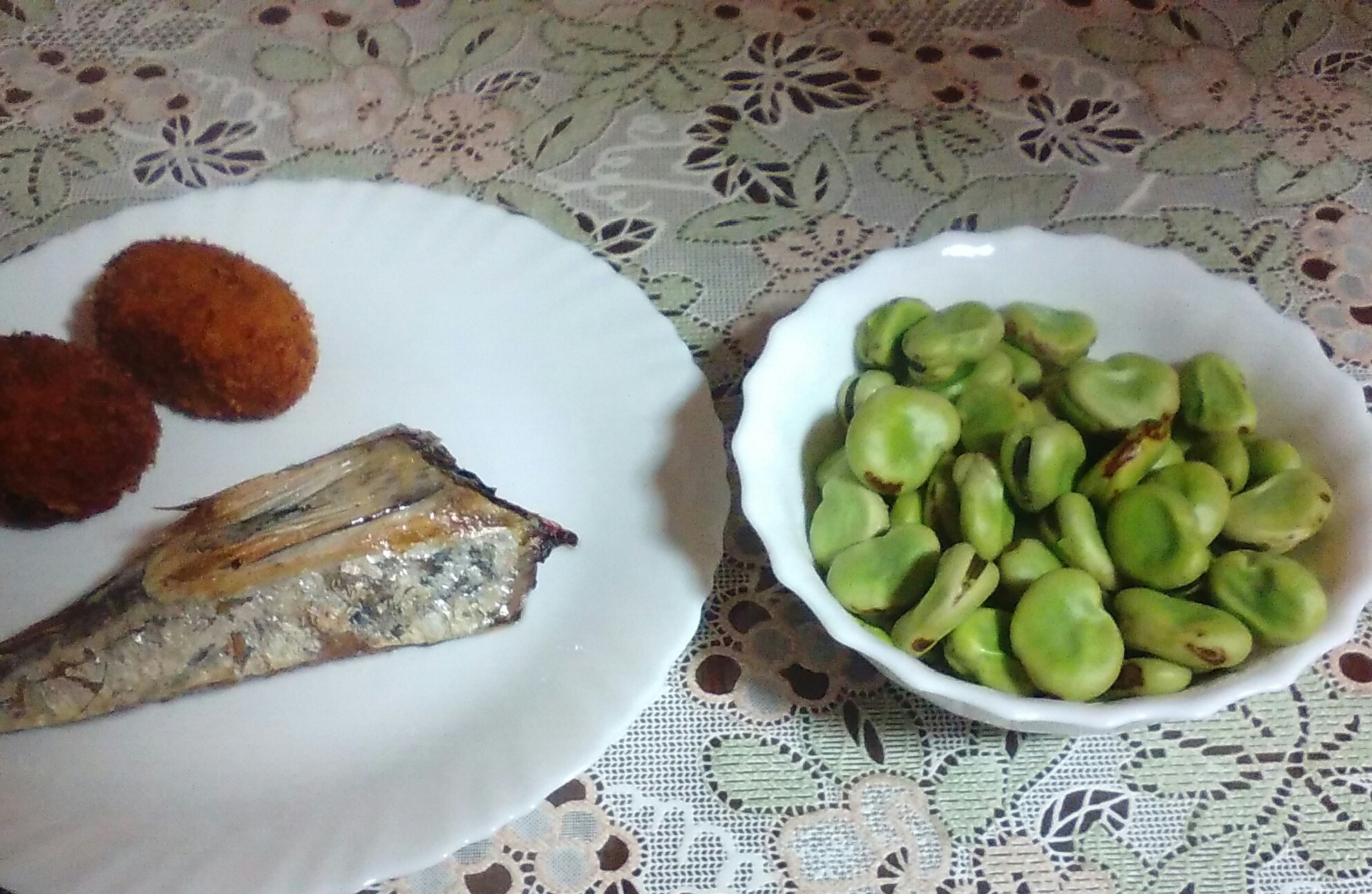 空豆を茹でて、かつおの腹皮を焼いて、地元で人気というコロッケを添えて。