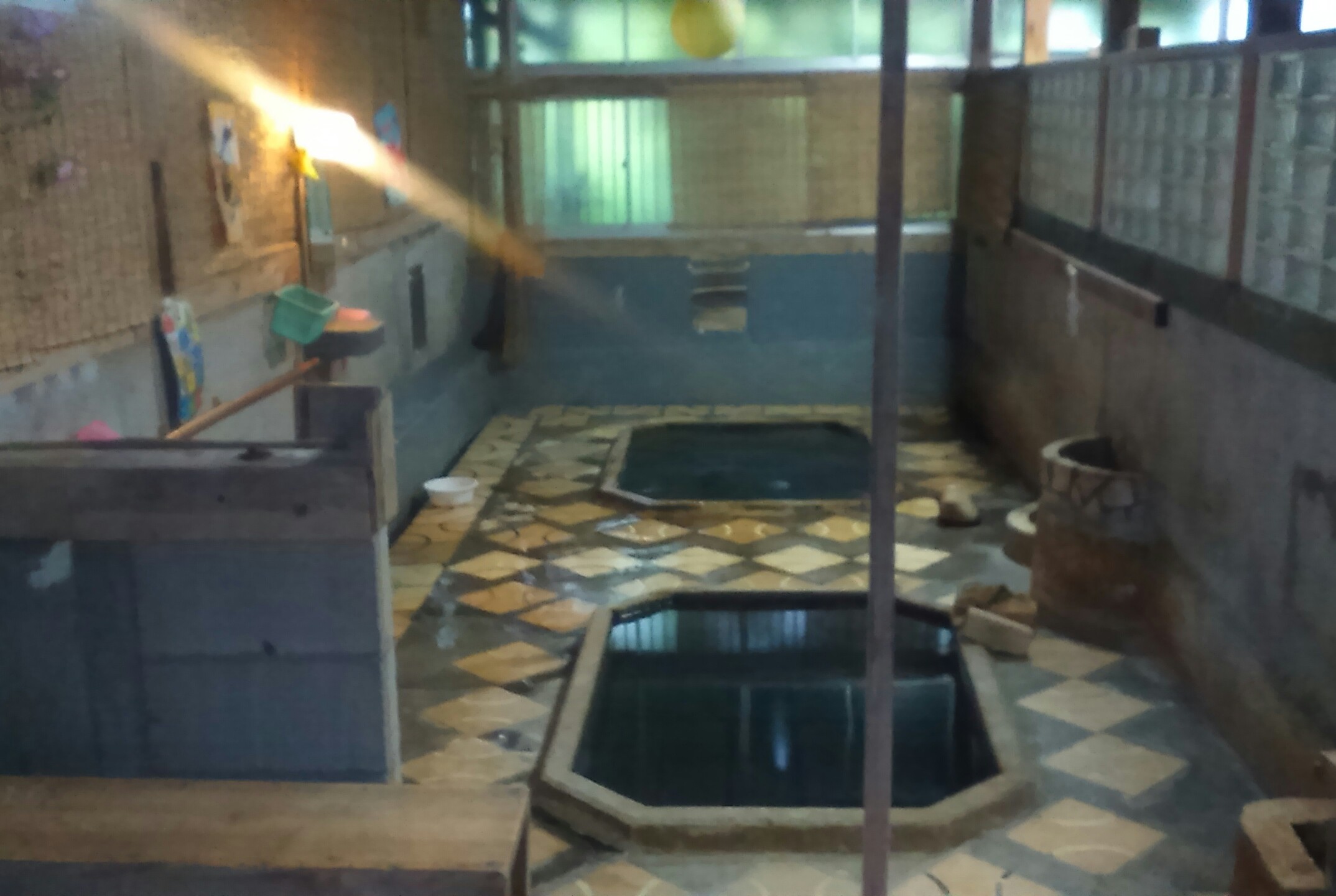 湯槽のぐるりは石、壁面はタイル、底は木。