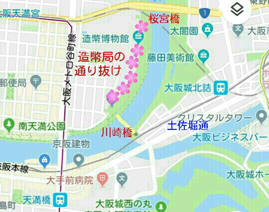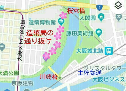 大阪城公園側から造幣局へ向かうには、大阪城北西方面で土佐堀通りを横切って京阪電車の地下道をくぐり、川崎橋で大川を渡るのが近道です。